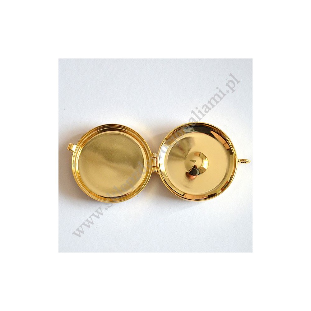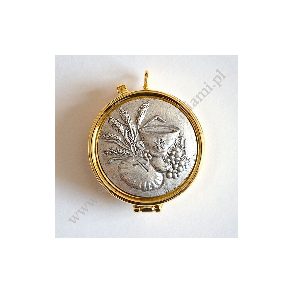 Cyborium mosiężne, złocone, zdobione aplikacją eucharystyczną