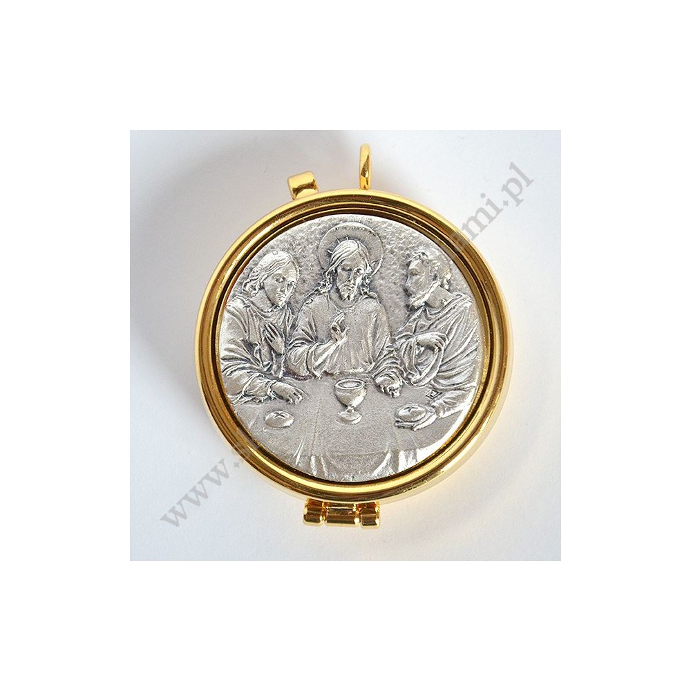 Cyborium mosiężne, złocone, zdobione aplikacją z wizerunkiem Ostatniej Wieczerzy