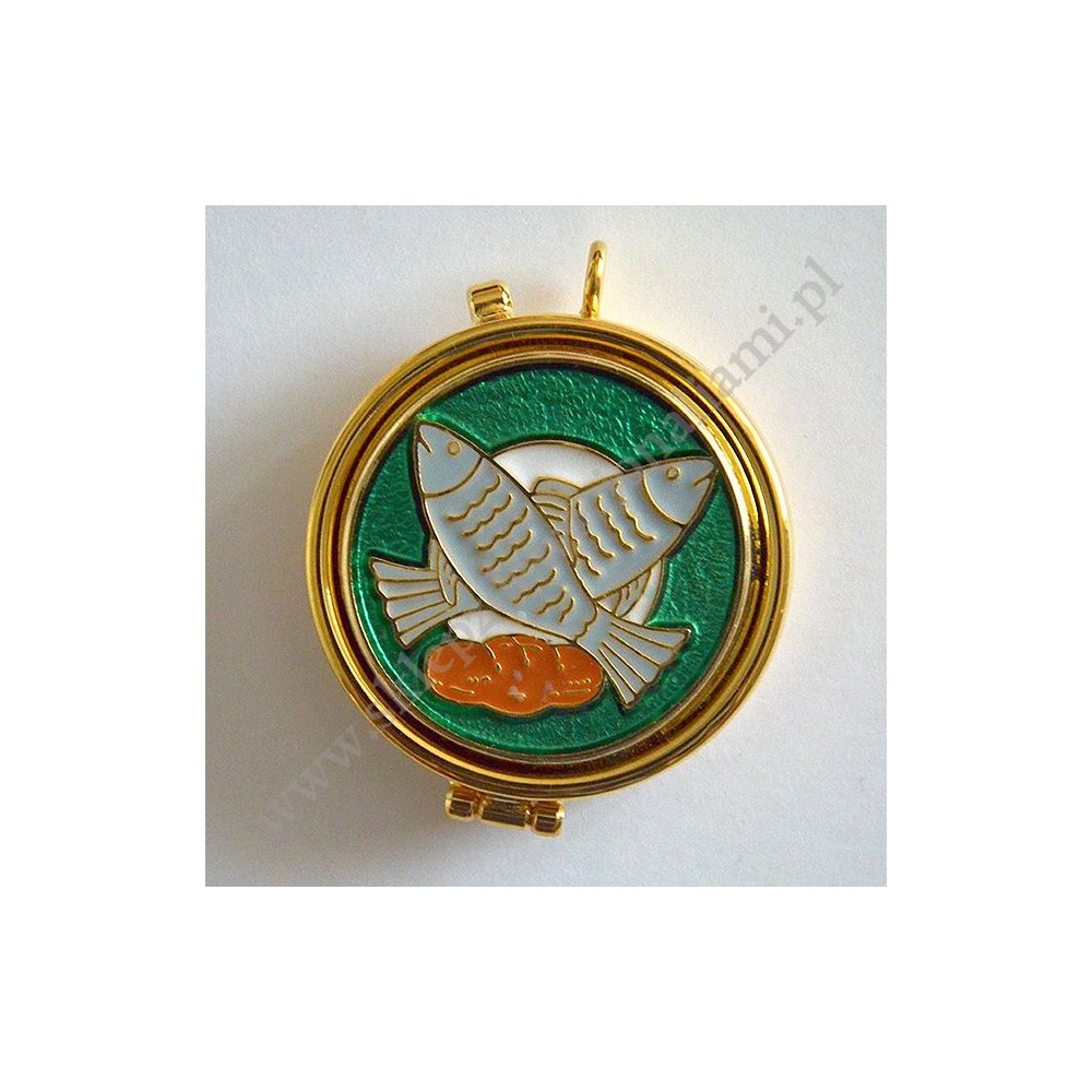 Cyborium mosiężne, złocone, zdobione aplikacją eucharystyczną