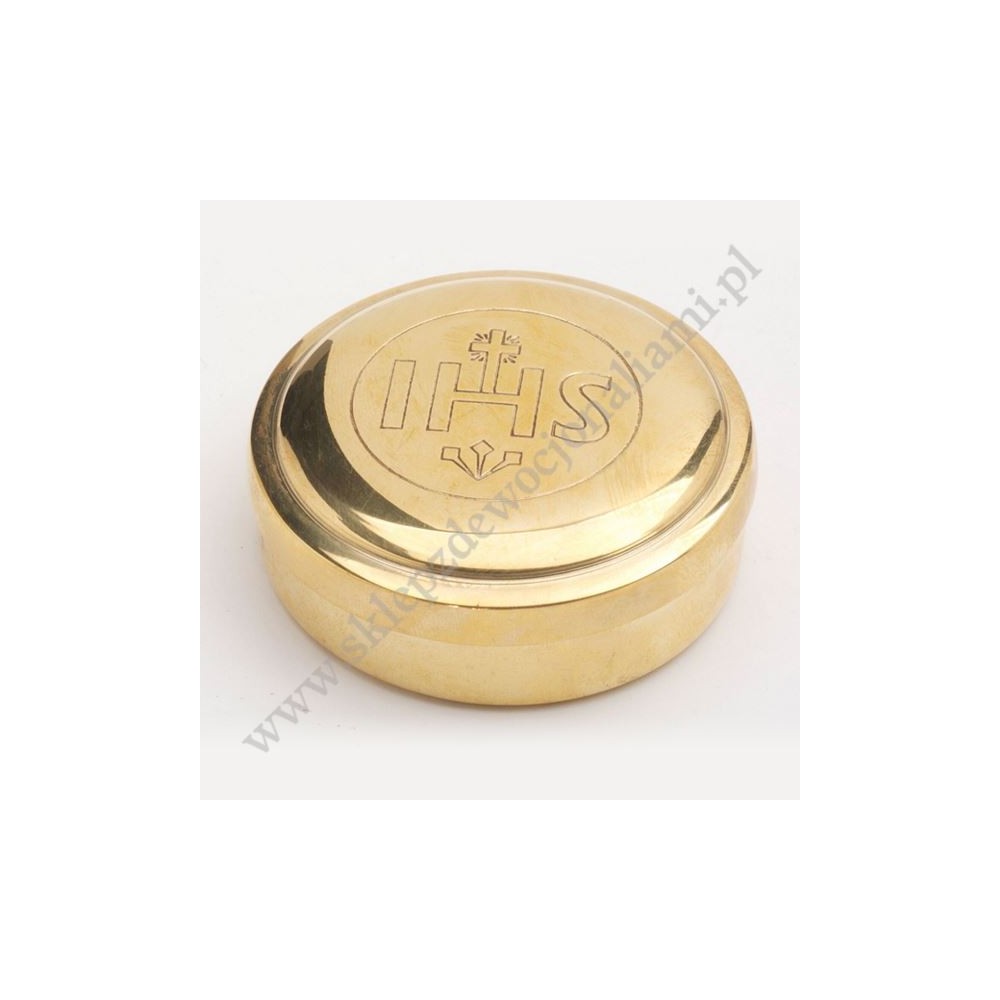 Cyborium mosiężne pozłacane o średnicy 8 cm i wysokości 3 cm.