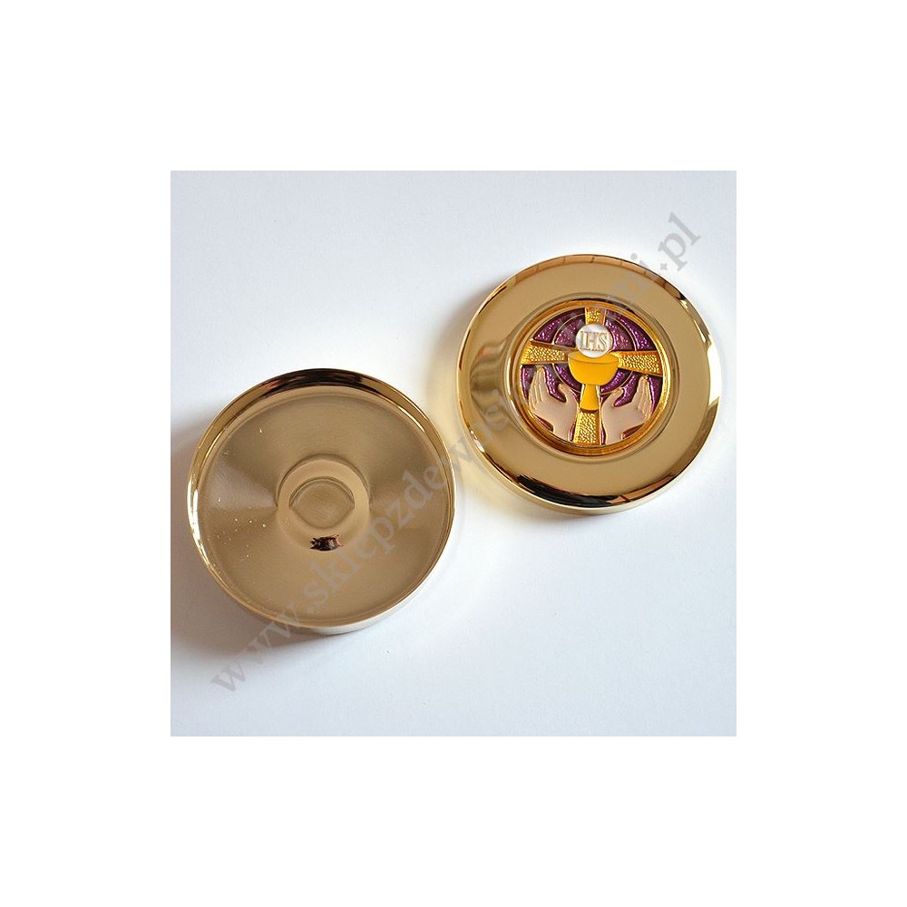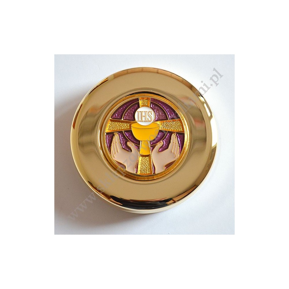 Cyborium mosiężne, pozłacane z emaliowaną aplilkacją eucharystyczną. Średnica cyborium 8 cm, głębokość cyborium 1.7 cm.