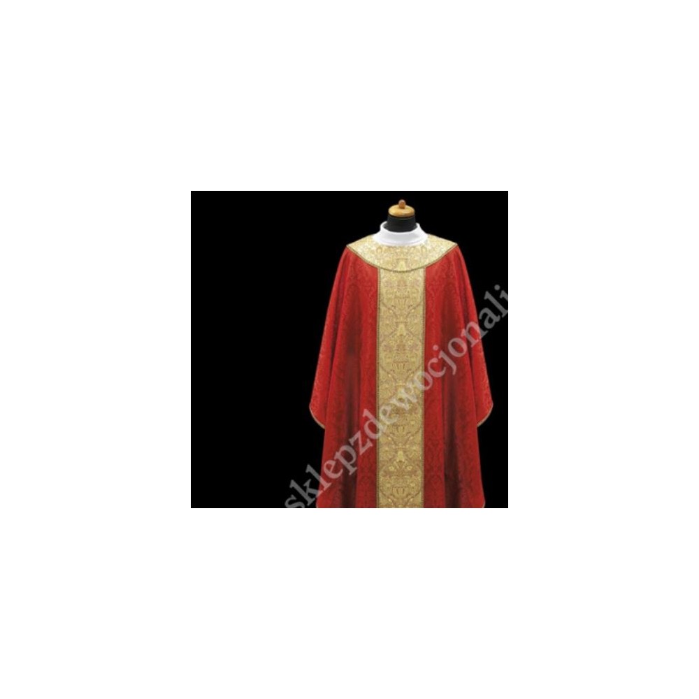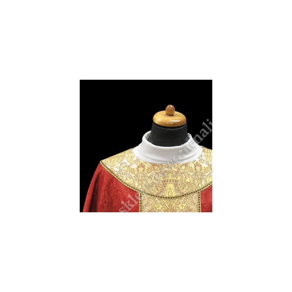 Ornat uszyty z ozdobnej tkaniny typu adamaszek ze stułą wewnętrzną, bez kołnierza.