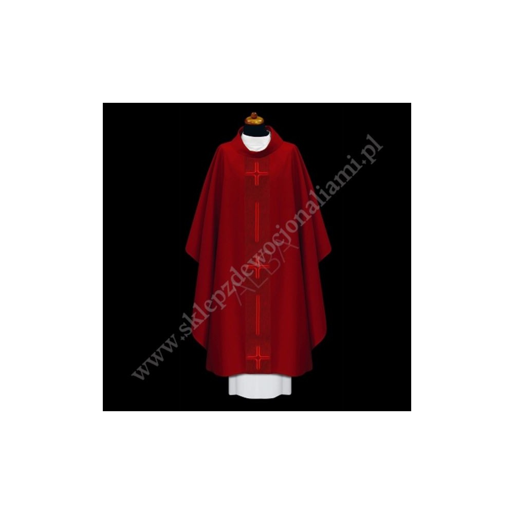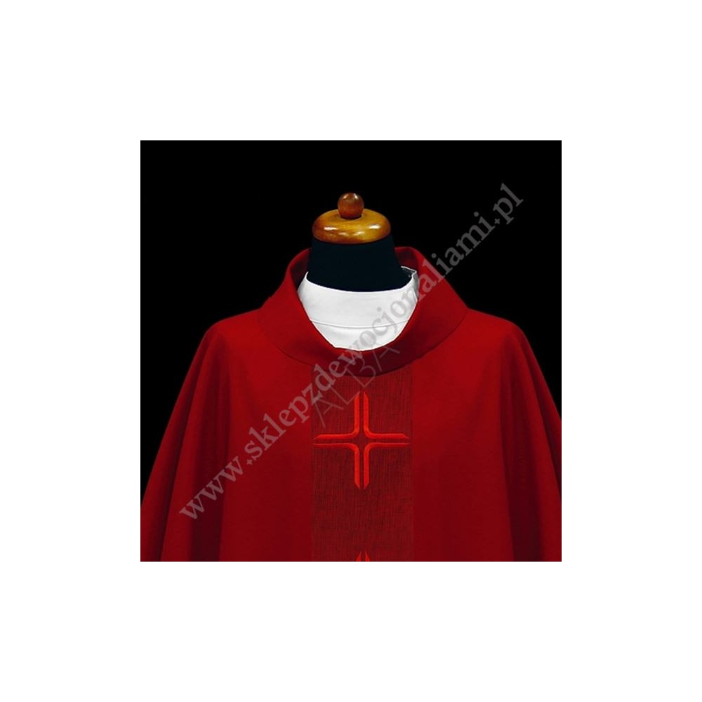Ornat wykonany z lekkiej tkaniny wełnianej z nowoczesnym haftem na pasie tkanym z grubej wełnianej przędzy.