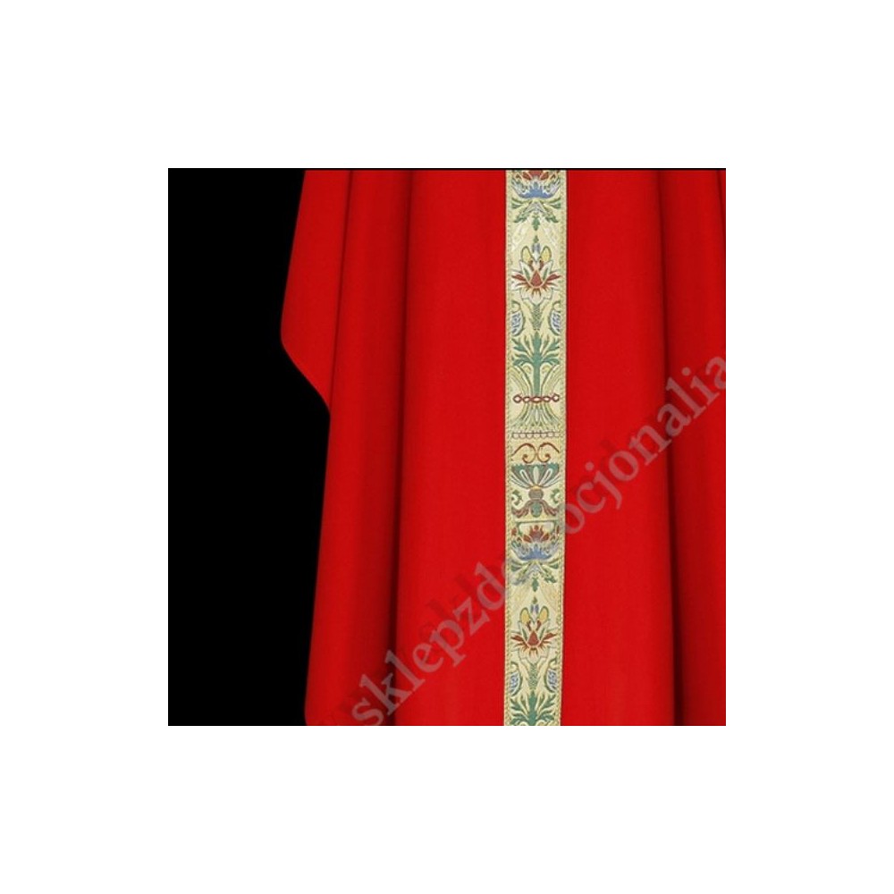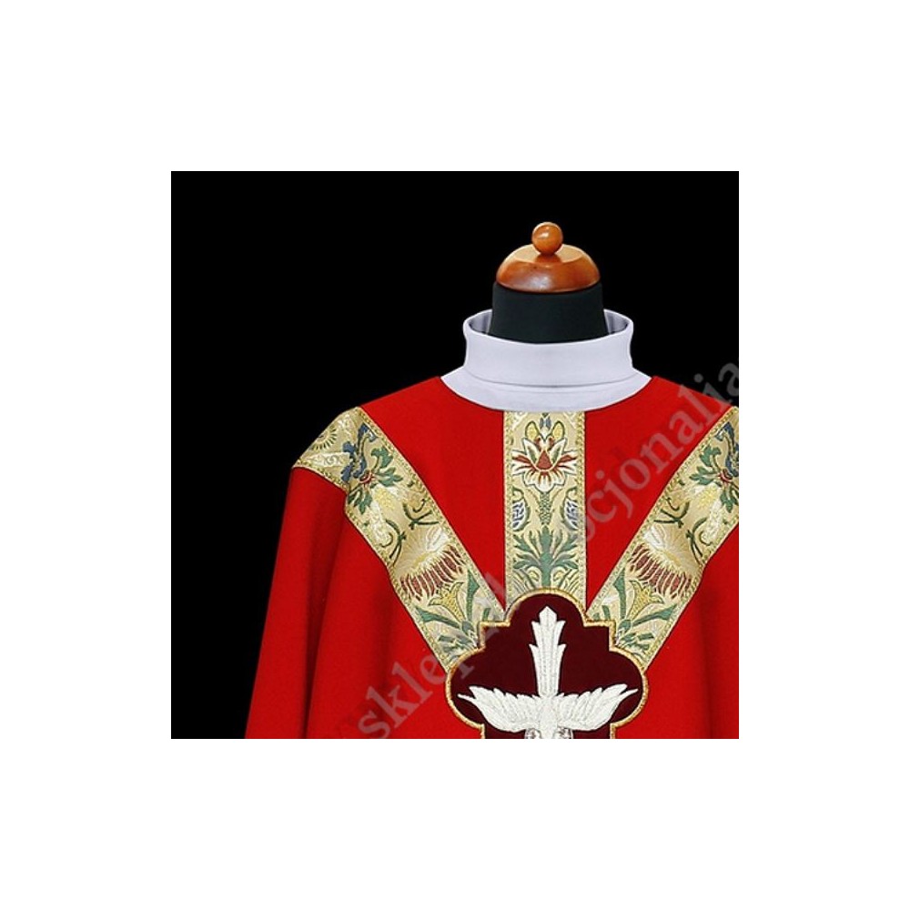 Ornat uszyty z bardzo lekkiej tkaniny ozdobiony wysokiej jakości barwnym galonem. Pośrodku haftowana na aksamicie aplikacja Ducha Świętego. Z tyłu ornatu również haft na aplikacji.