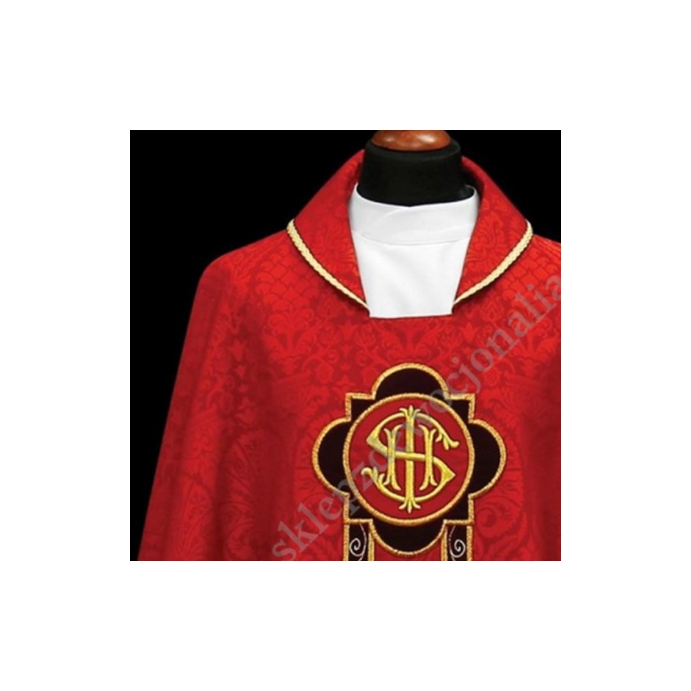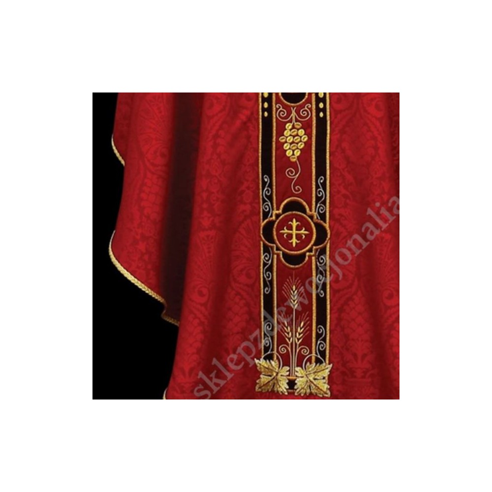 Ornat uszyty z ozdobnej tkaniny typu adamaszek ozdobiony wypukłym haftem, kombinacja apikacji z aksamitu i haftu na tkaninie. Haft wzbogacają wstawki z satyny i złotej taśmy.