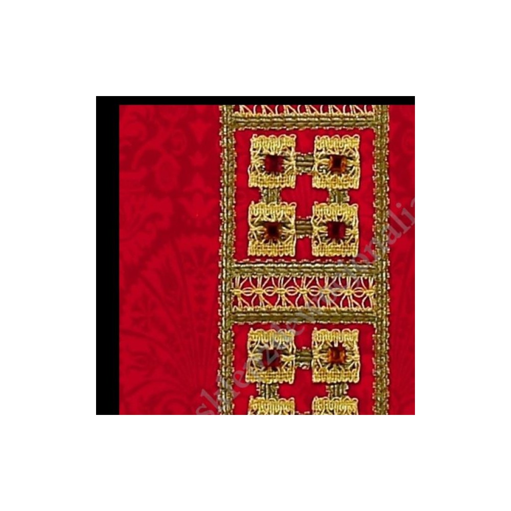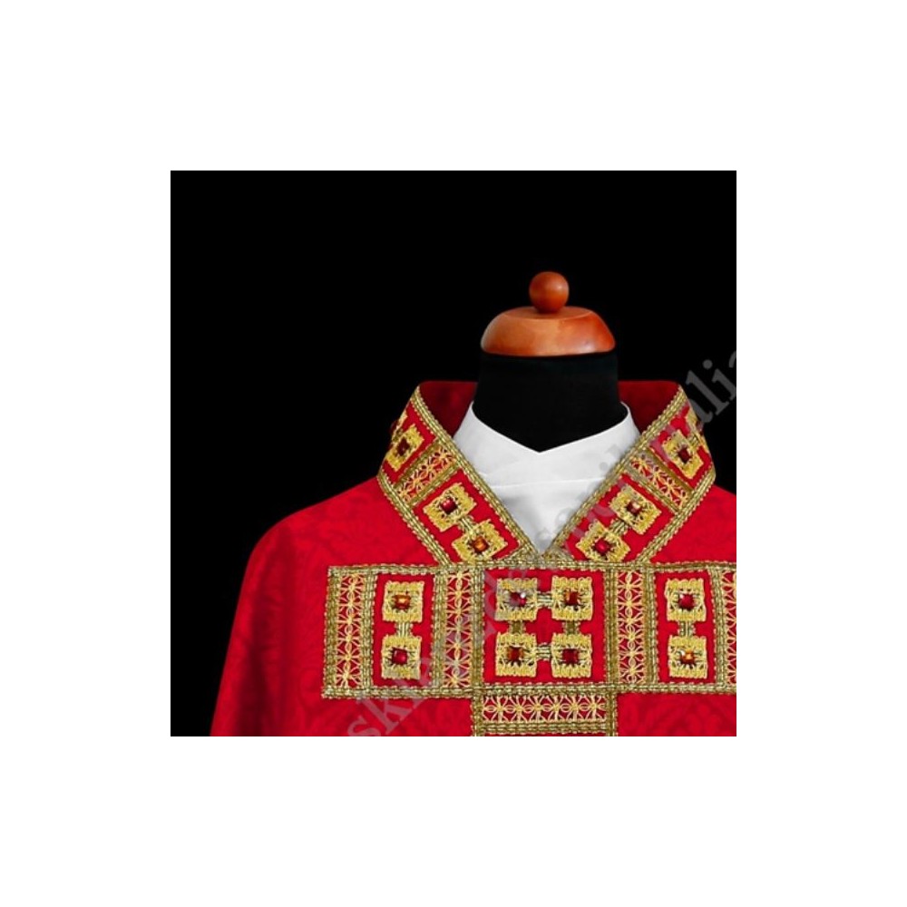 Ornat uszyty z ozdobnej tkaniny, z ręcznie naszywanymi ozdobami z taśm i kamienieni. Stuła wewnętrzna również z bogatymi zdobieniami.