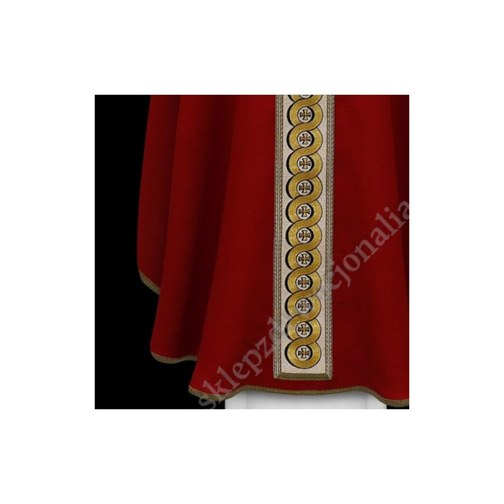Ornat bogato haftowany na pasie , uszyty z lekkiej tkaniny i wykończony złotą pasmanterią.