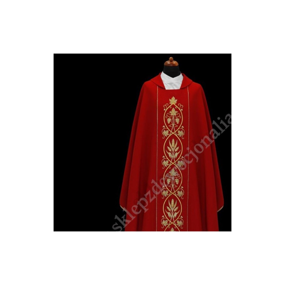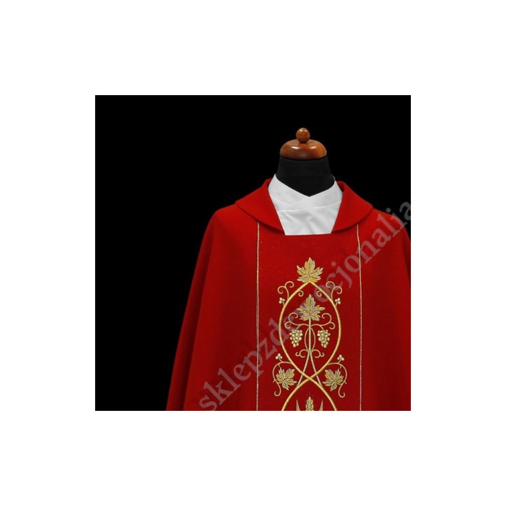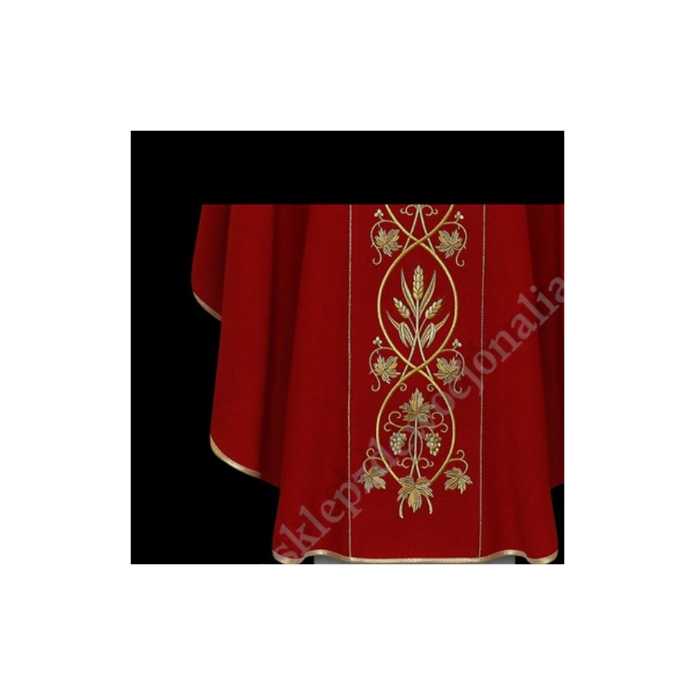 Ornat uszyty z lekkiej tkaniny w stylu gotyckim ze stułą wewnętrzną z bogatym haftem na pasie. Całość wykończona atłasową lamówką.