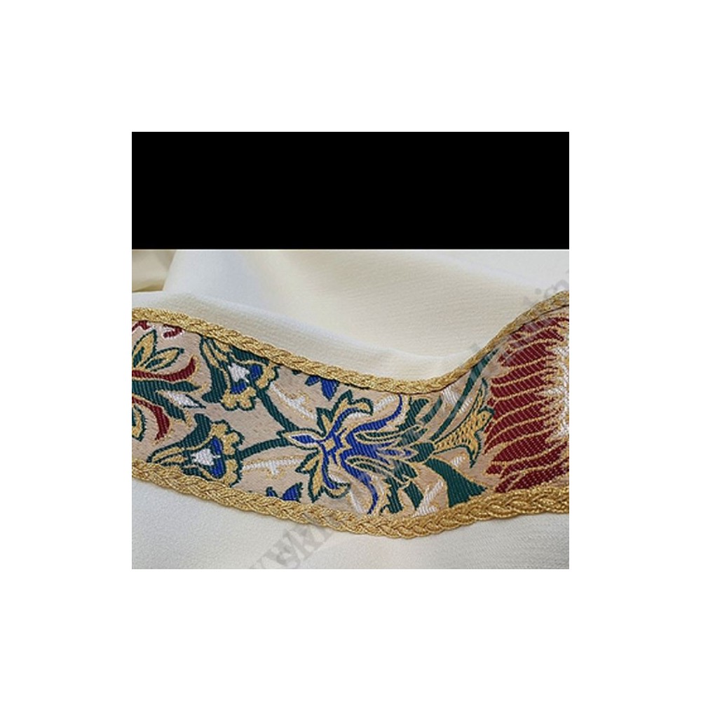 Dalmatyka z pasem tkanym wykończona ozdobną złotą taśmą.