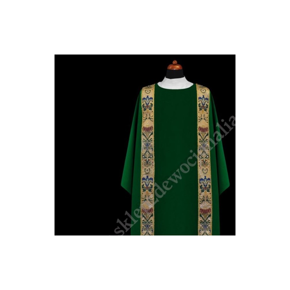 Dalmatyka z pasem tkanym wykończona ozdobną złotą taśmą.