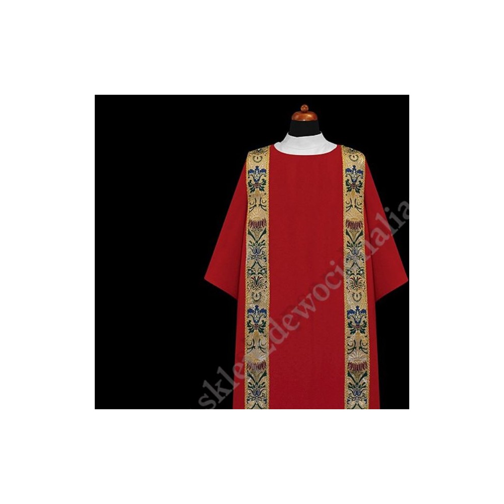 Dalmatyka z pasem tkanym wykończona ozdobną złotą taśmą.