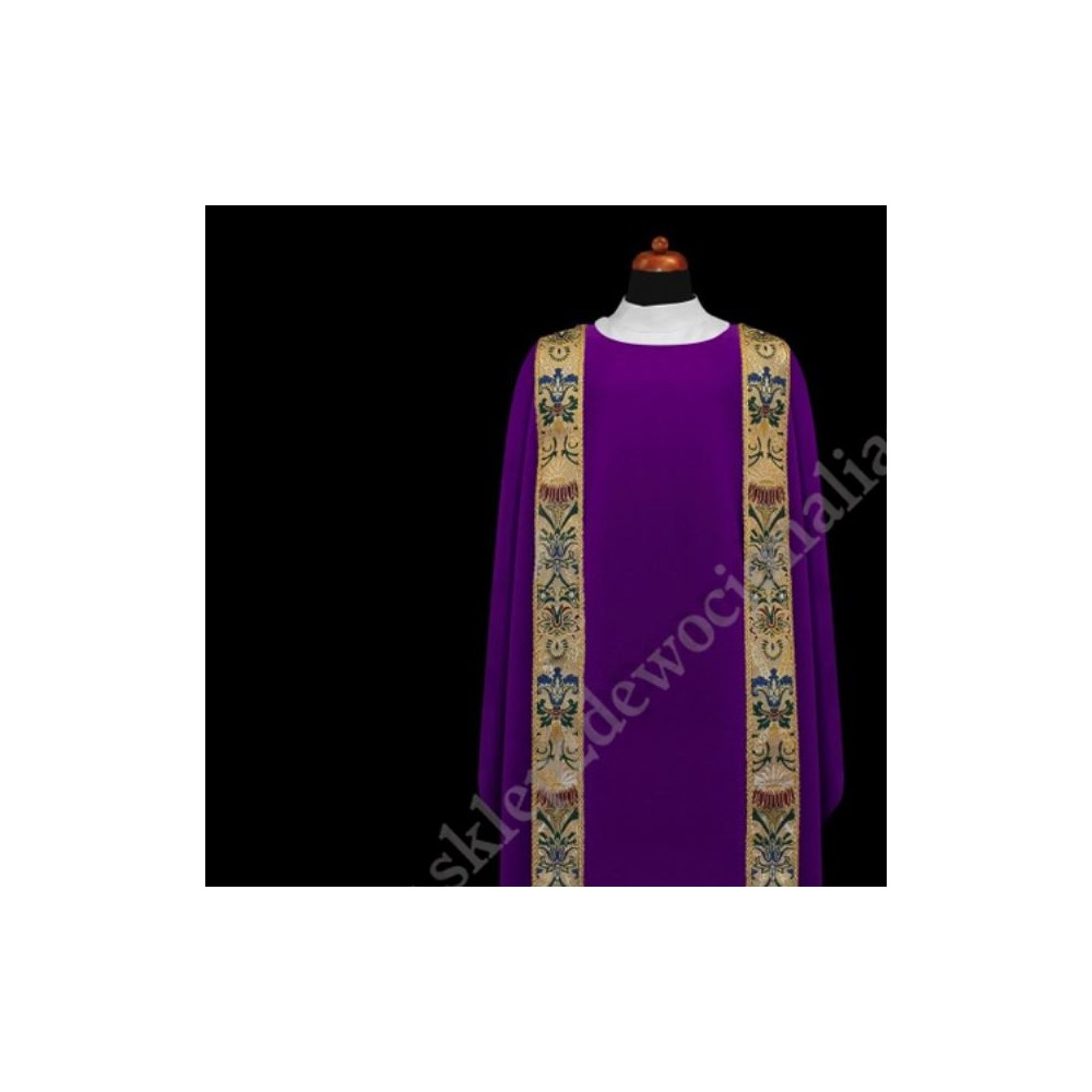 Dalmatyka z pasem tkanym wykończona ozdobną złotą taśmą.