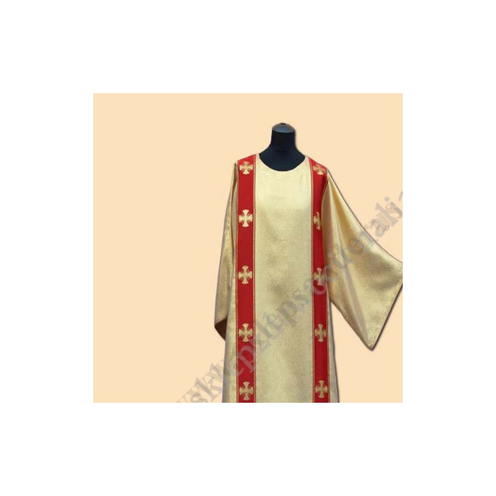 Złota dalmatyka diakońska zdobiona dwoma czerwonymi pasami z ornamentami krzyża