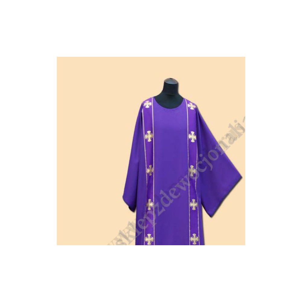 Fioletowa dalmatyka diakońska zdobiona dwoma fioletowymi pasami z ornamentami krzyża