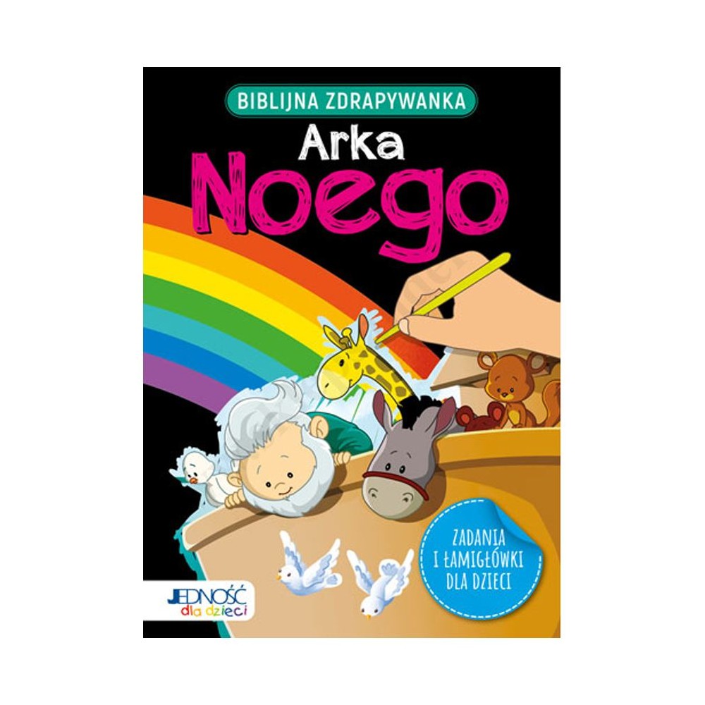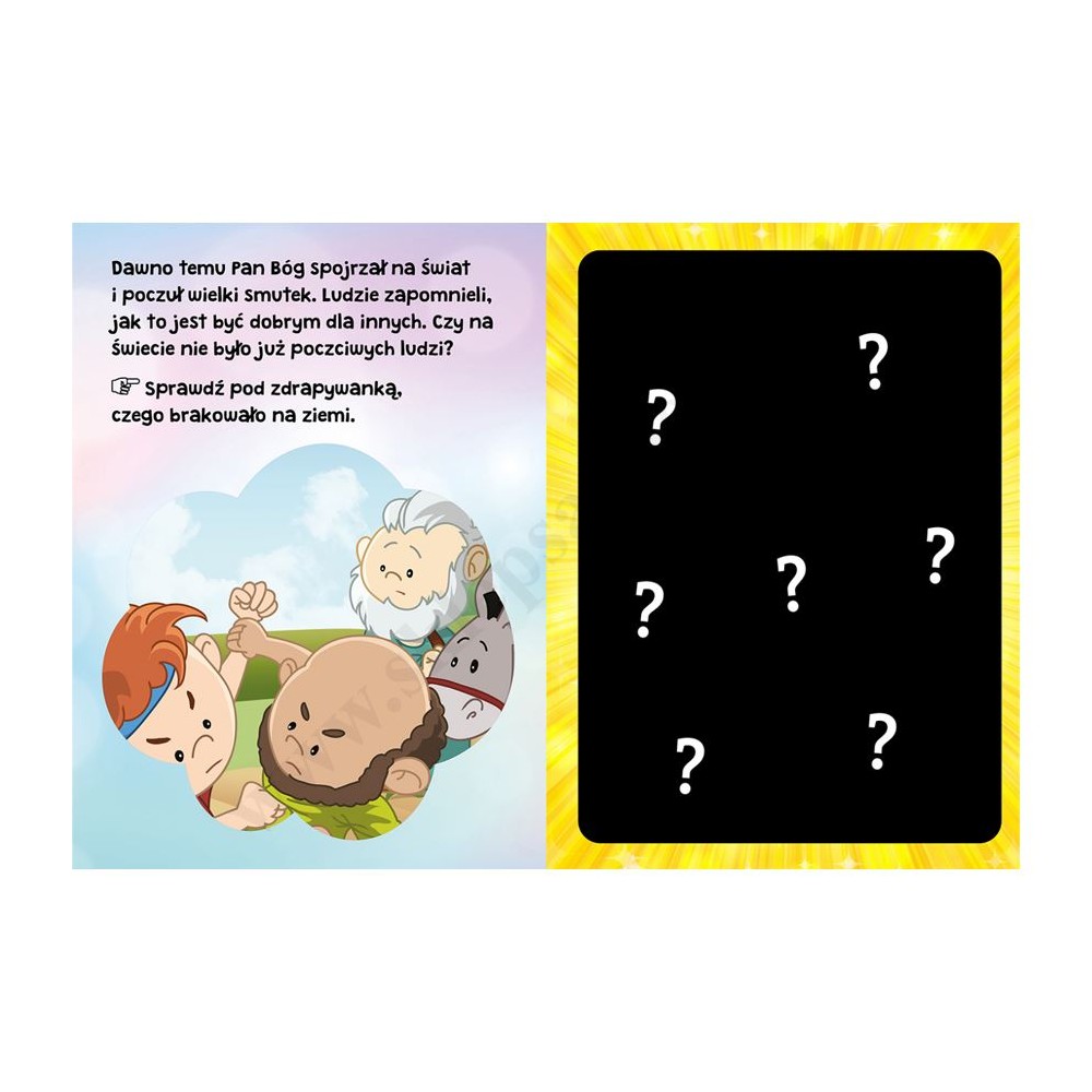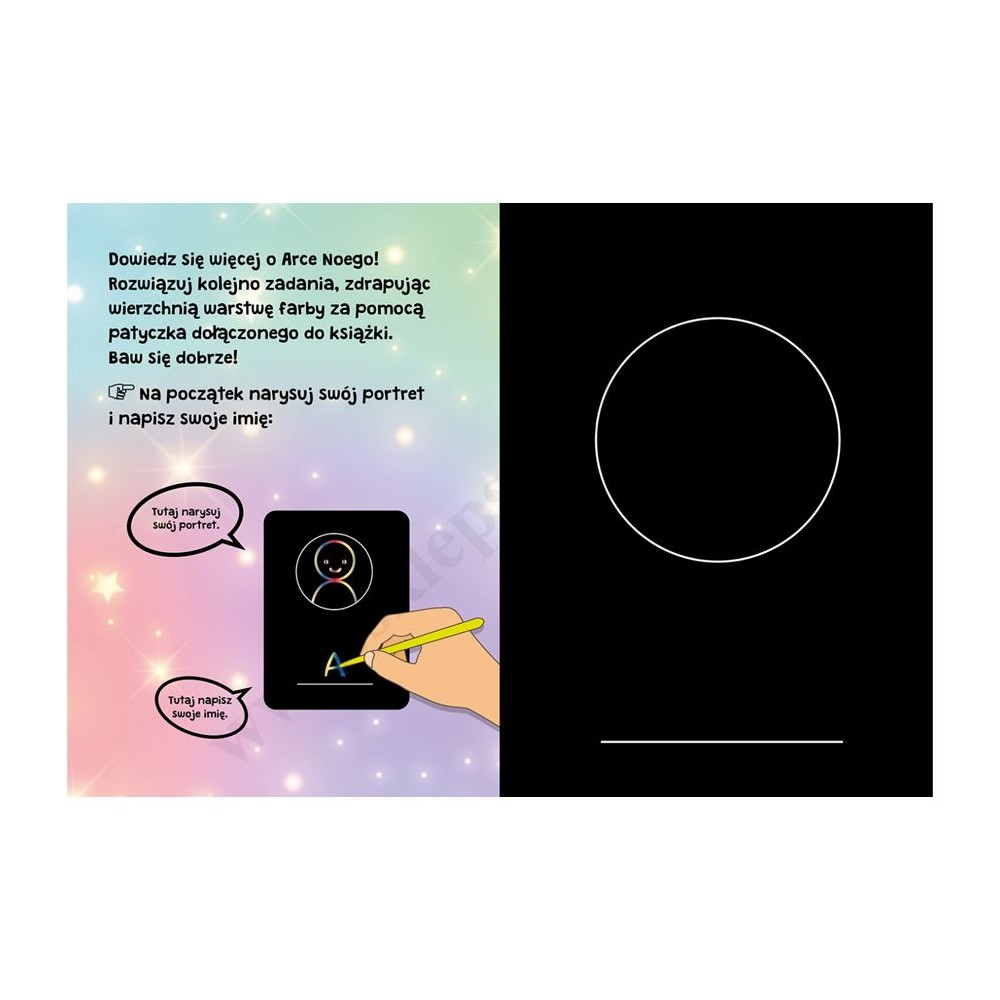 Dowiedz się więcej o Arce Noego! Rozwiązuj kolejno zadania, zdrapując wierzchnią warstwę farby za pomocą patyczka dołączonego do książki. Baw się dobrze!