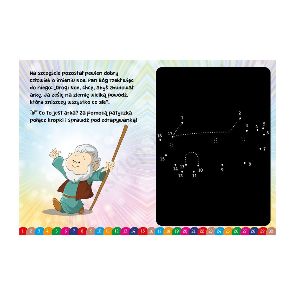 W tej kartonowej książeczce dziecko znajdzie mnóstwo aktywności, które polegają na zdrapywaniu czarnej farby pokrywającej kolejne kartki, aby wykonać zadanie i odkryć, co znajduje się pod spodem. Do każdego zeszytu dołączony jest plastikowy patyczek, dzięki czemu wszystko, co potrzebne do zabawy, jest zawsze pod ręką. Twarda oprawa i spiralny grzbiet sprawiają, że książeczka jest idealna do zabrania ze sobą, by wypełnić czas ciekawymi zadaniami. To świetne połączenie: rozwijanie kreatywności i poznawanie Biblii w tym samym czasie.