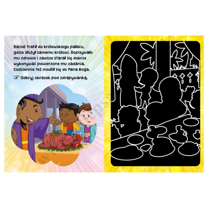 Poznaj historię odważnego Daniela, który dzięki modlitwie, odwadze i Bożej opiece uniknął śmierci w jaskini pełnej lwów! Rozwiązuj kolejno zadania, zdrapując wierzchnią warstwę farby za pomocą patyczka dołączonego do książki. Baw się dobrze!