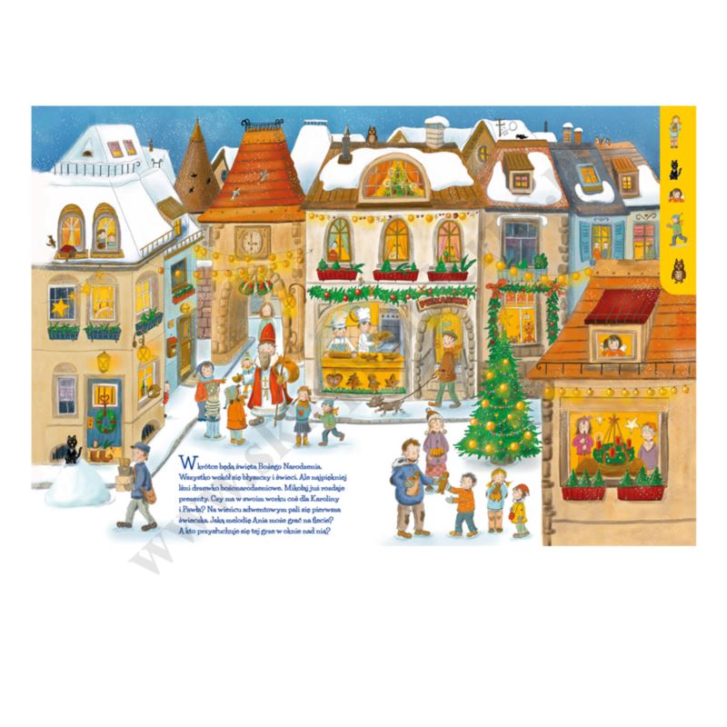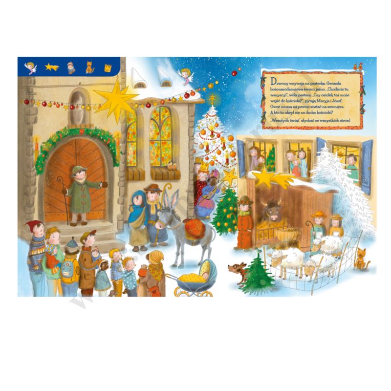 Dzieci uwielbiają czas Adwentu i Bożego Narodzenia, gdy wokół panuje nastrój oczekiwania i możemy cieszyć się świątecznymi zwyczajami. Ta kartonowa książka z dużymi, kolorowymi obrazkami, na których ukryte są rozmaite szczegóły, zaprasza do odwiedzenia przedświątecznego jarmarku, obejrzenia jasełek i wybrania się do kościoła na bożonarodzeniową mszę. Na każdej stronie znajdziemy krótki tekst i małe elementy do wyszukania na pełnej detali dużej ilustracji. Wśród nich ukrywają się również bożonarodzeniowe aniołki! Liczne szczegóły zachęcają dzieci do wspólnej rozmowy o ich ulubionych tradycjach i nastroju oczekiwania na święta. Zdobiona czerwoną folią metaliczną okładka zachęca, by zajrzeć do środka książki i odkrywać kolejne strony.