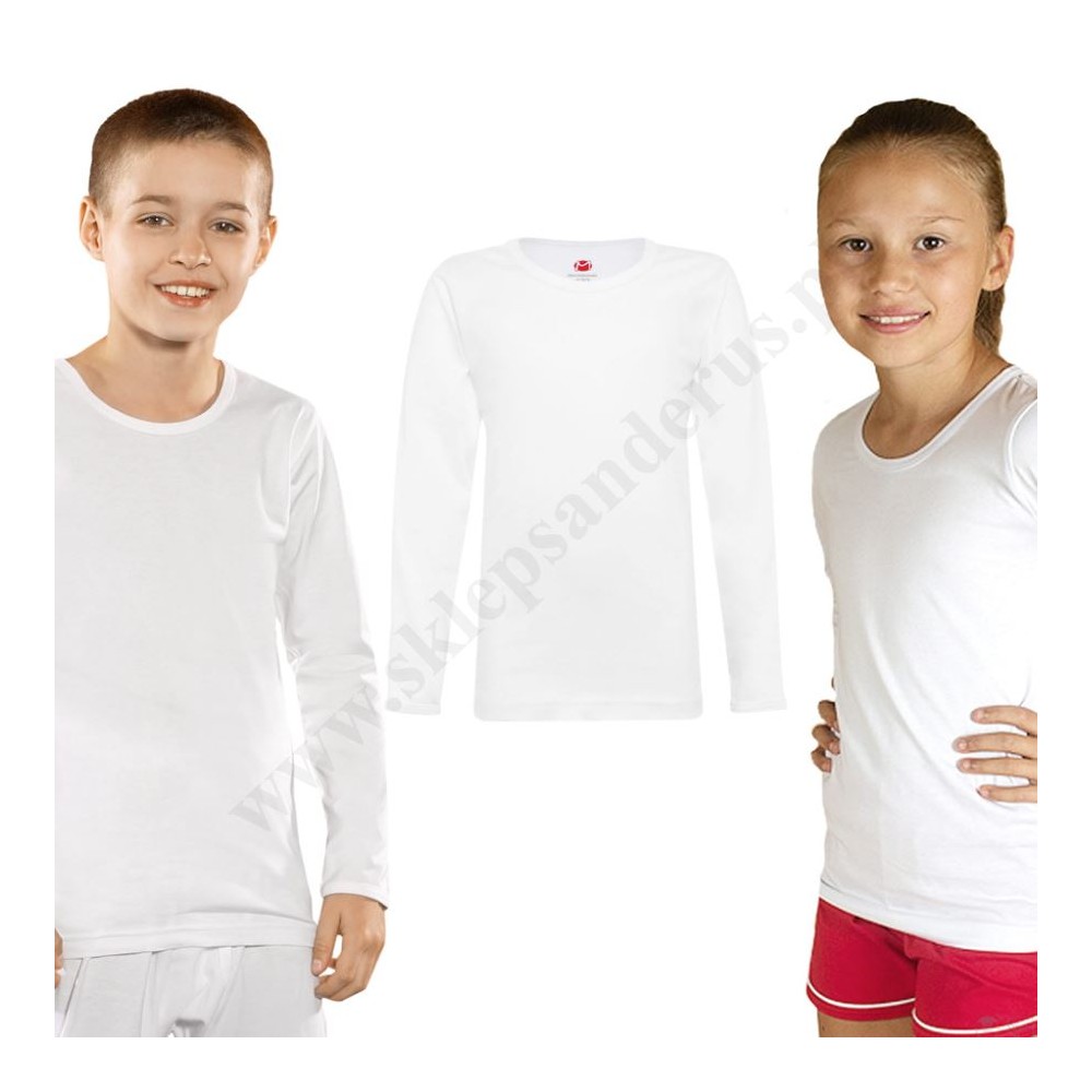 Biała bawełniana podkoszulka dla dzieci, uszyta z 100% bawełny. Podkoszulek dziecięcy na długi rękaw o prostym, klasycznym fasonie. Poprzez swoją uniwersalność nadaje się dla chłopca i dziewczynki. Dzianina bawełniana najwyższej jakości jest bardzo miękka i delikatna dla skóry dziecka. Materiał jest oddychający i nie powoduje podrażnień.