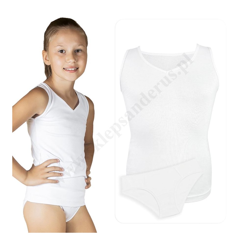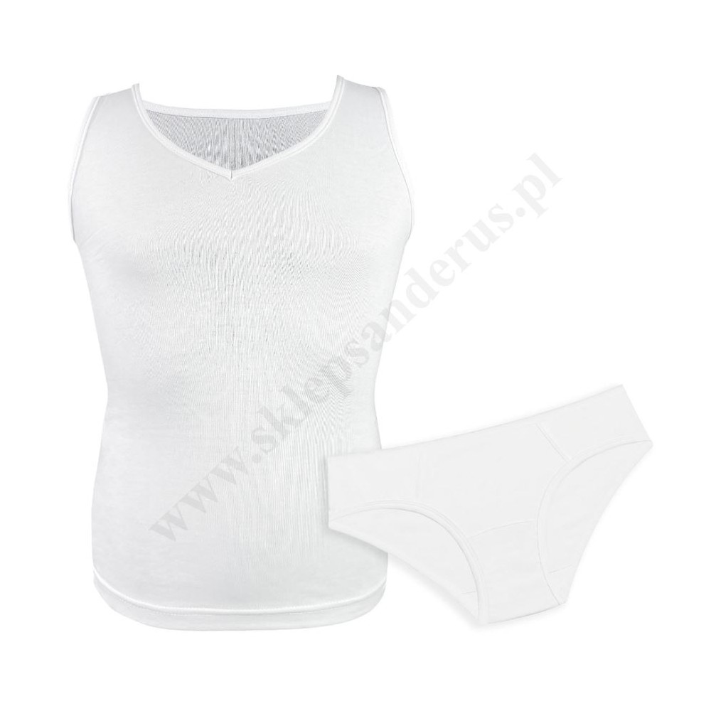Bielizna dla dziewczynki, komplet składający sie z podkoszulka na szerokich ramiączkach oraz gładkich, białych majtek.