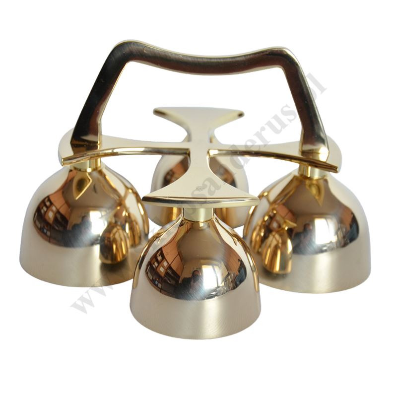Dzwonek mosiężny poczwórny o wysokości 11.5 cm i szerokości 18 cm.