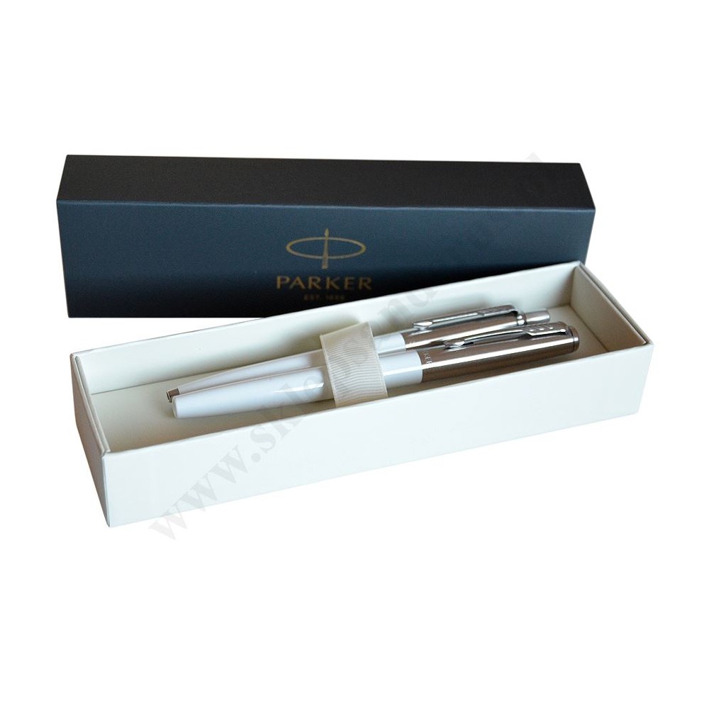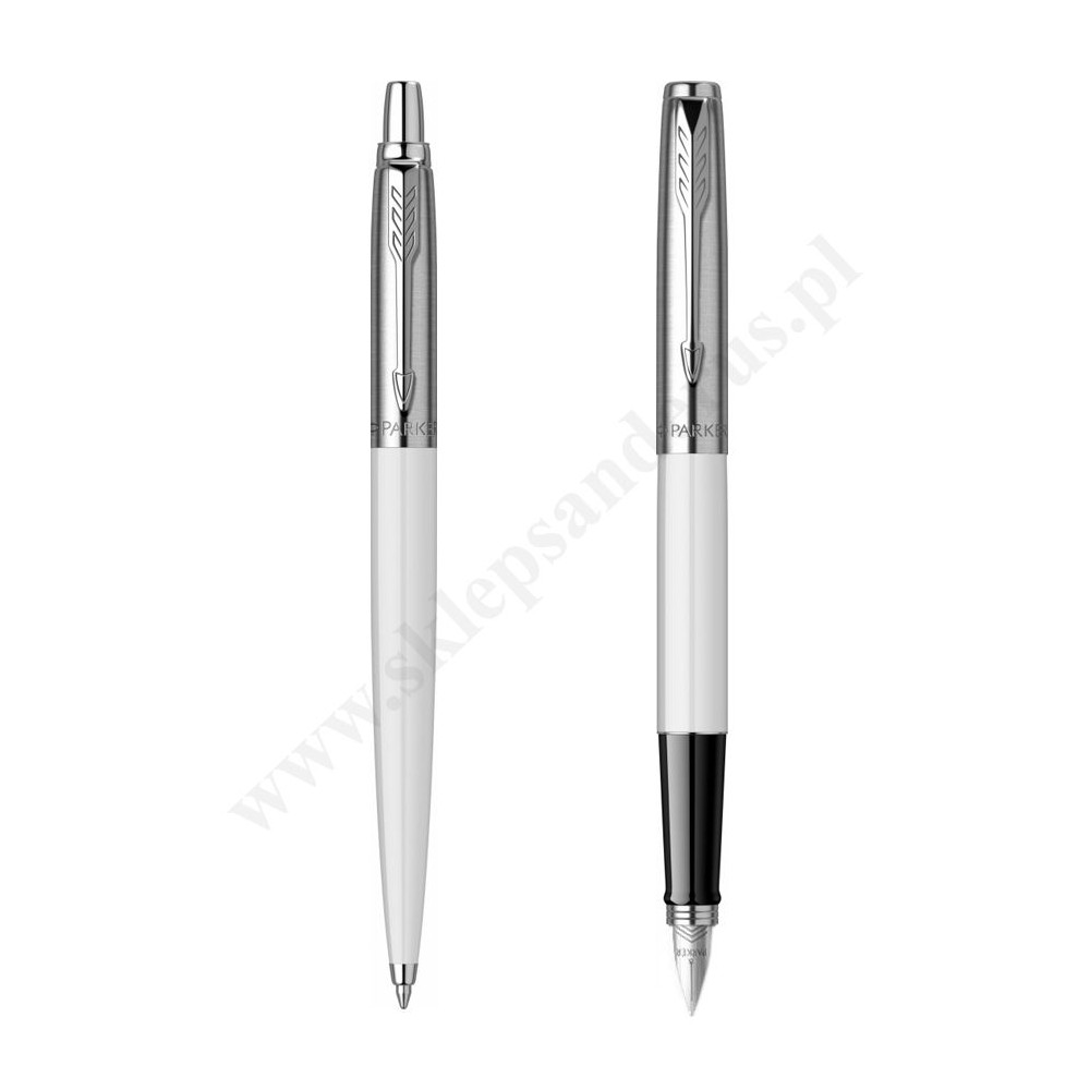Zestaw Parkera składający się z długopisu oraz pióra wiecznego typu Parker Jotter, całość zapakowana w oryginalne pudełko.