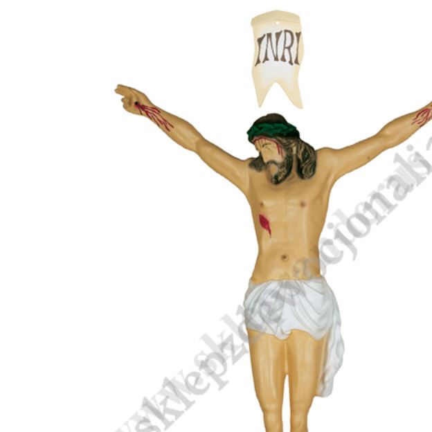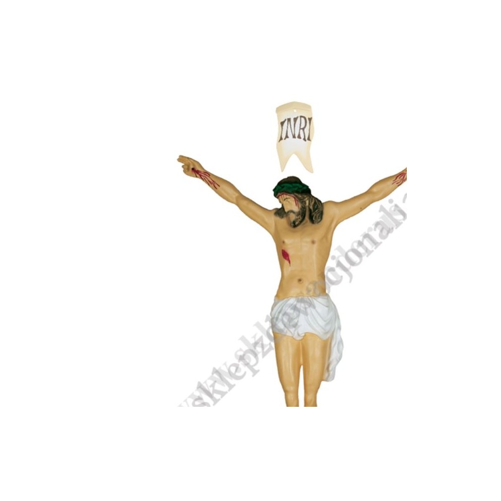 Korpus Chrystusa na krzyż - figura żywiczna w wersji wielobarwnej o przekątnej 125 cm, rozstaw rąk 80 cm, wysokość od stóp do głowy 113 cm, wysokość od stóp do rąk (w pionie) 123 cm.