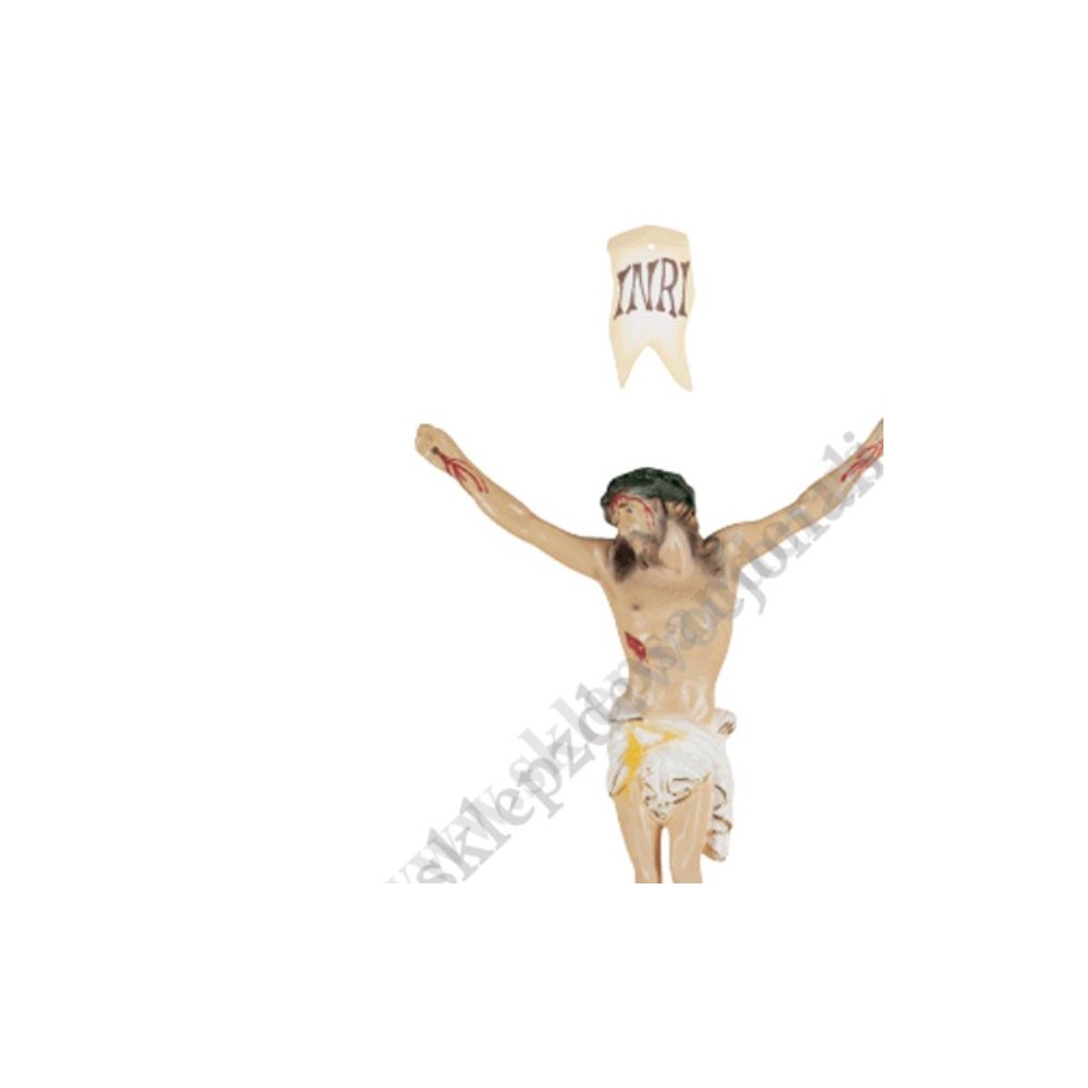 Korpus Chrystusa na krzyż - figura wykonana z żywicy epoksydowej w wersji wielobarwnej o przekątnej 33 cm, rozpiętość ramion 26 cm.