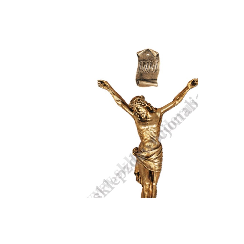 Korpus Chrystusa na krzyż - figura wykonana z żywicy epoksydowej w wersji patyny złotej o przekątnej 65 cm, rozpiętość ramion 35 cm.