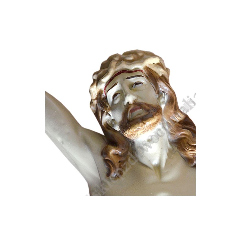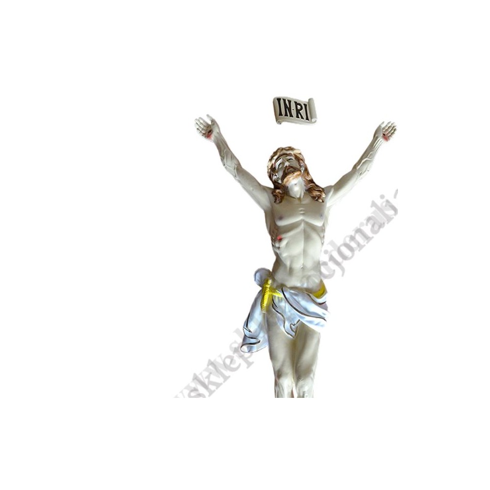 Korpus Chrystusa na krzyż - figura żywiczna w wersji wielobarwnej o przekątnej 82 cm, rozstaw rąk 40 cm, wysokość od rąk do nóg 79 cm.