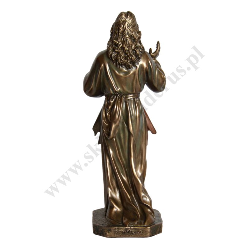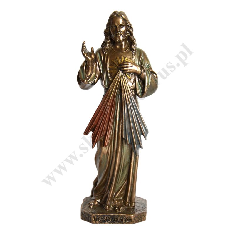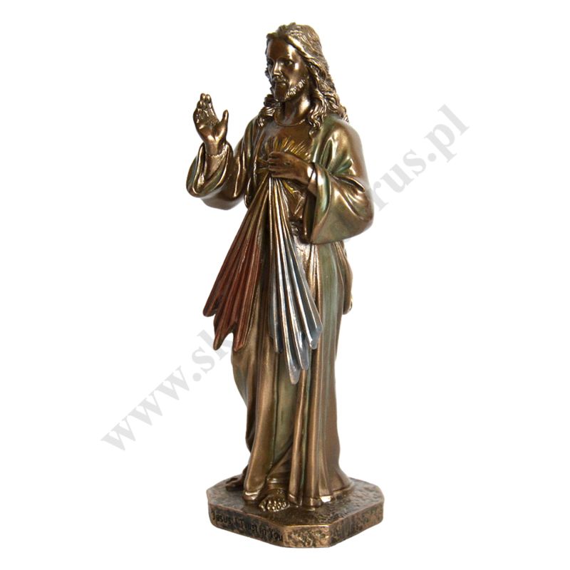 Figurka Jezu Ufam Tobie wykonana z poliresingu czyli konglomeratu żywicy, mączki alabastrowej i ceramicznej, pokryta brązem. Wysokość figury 15.4 cm, szerokość figury 6 cm, głębokość figury 4.7 cm.