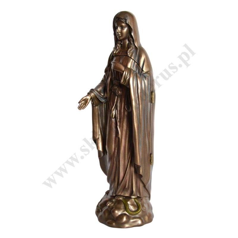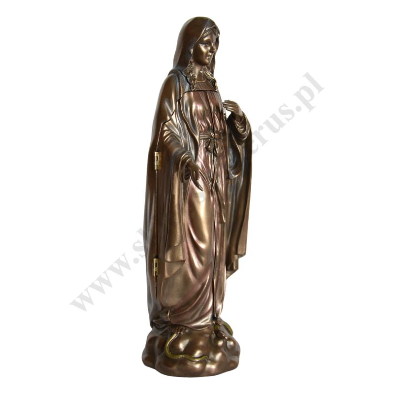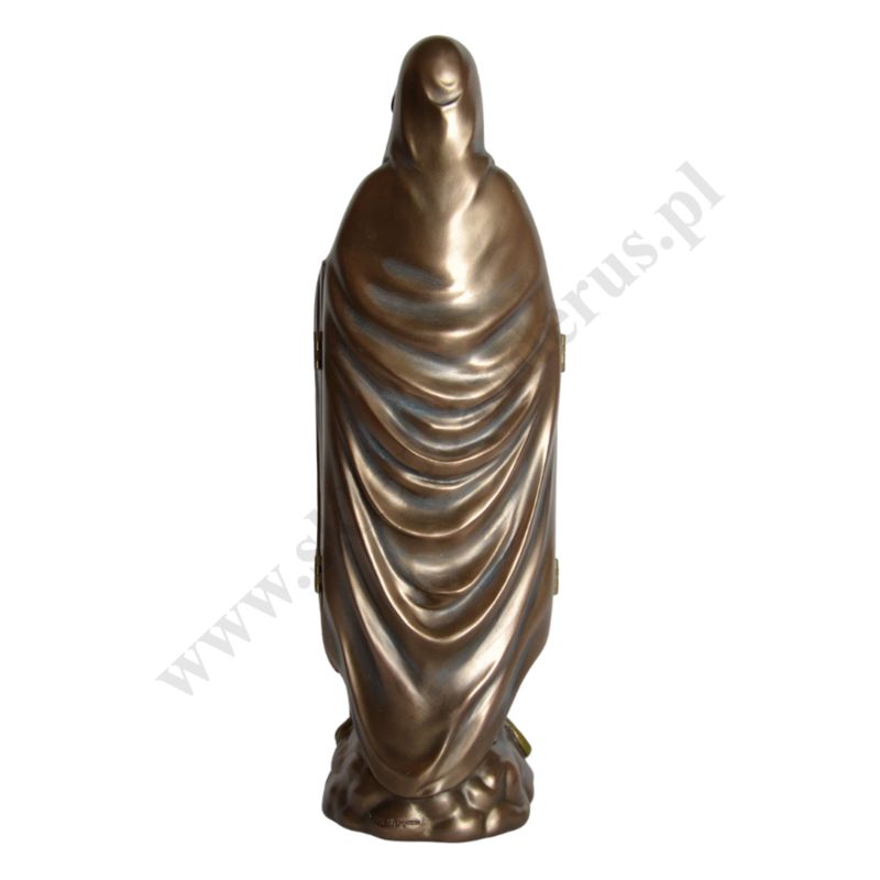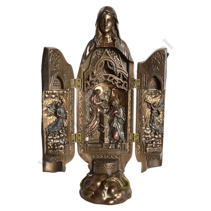 Figura Matki Bożej Łaskawej w postaci poliptyku, po otwarciu scena zwiastowania Najświętszej Maryi Panny. Wysokość 28.5 cm, szerokość 9 cm, szerokość po otwarciu 17.2 cm. Wykonana z poliresingu czyli konglomeratu żywicy, mączki alabastrowej i ceramicznej, pokryta brązem.