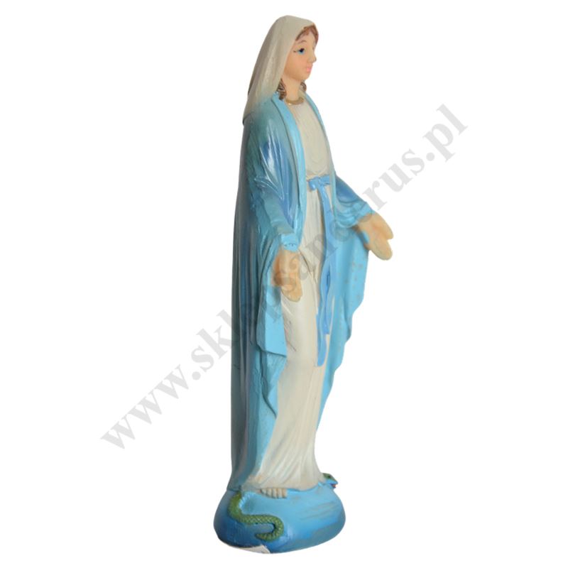 Figurka Matki Bożej Niepokalanej wykonana z żywicy o wysokoci 13.7 cm, szerokości 5.5 cm i głębokości 3.4 cm.