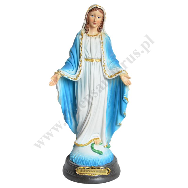 Figurka Matki Bożej Niepokalanej wykonana z tworzywa sztucznego o wysokości 29.5 cm, szerokości 13.5 cm i głębokości w podstawie 10.4 cm.