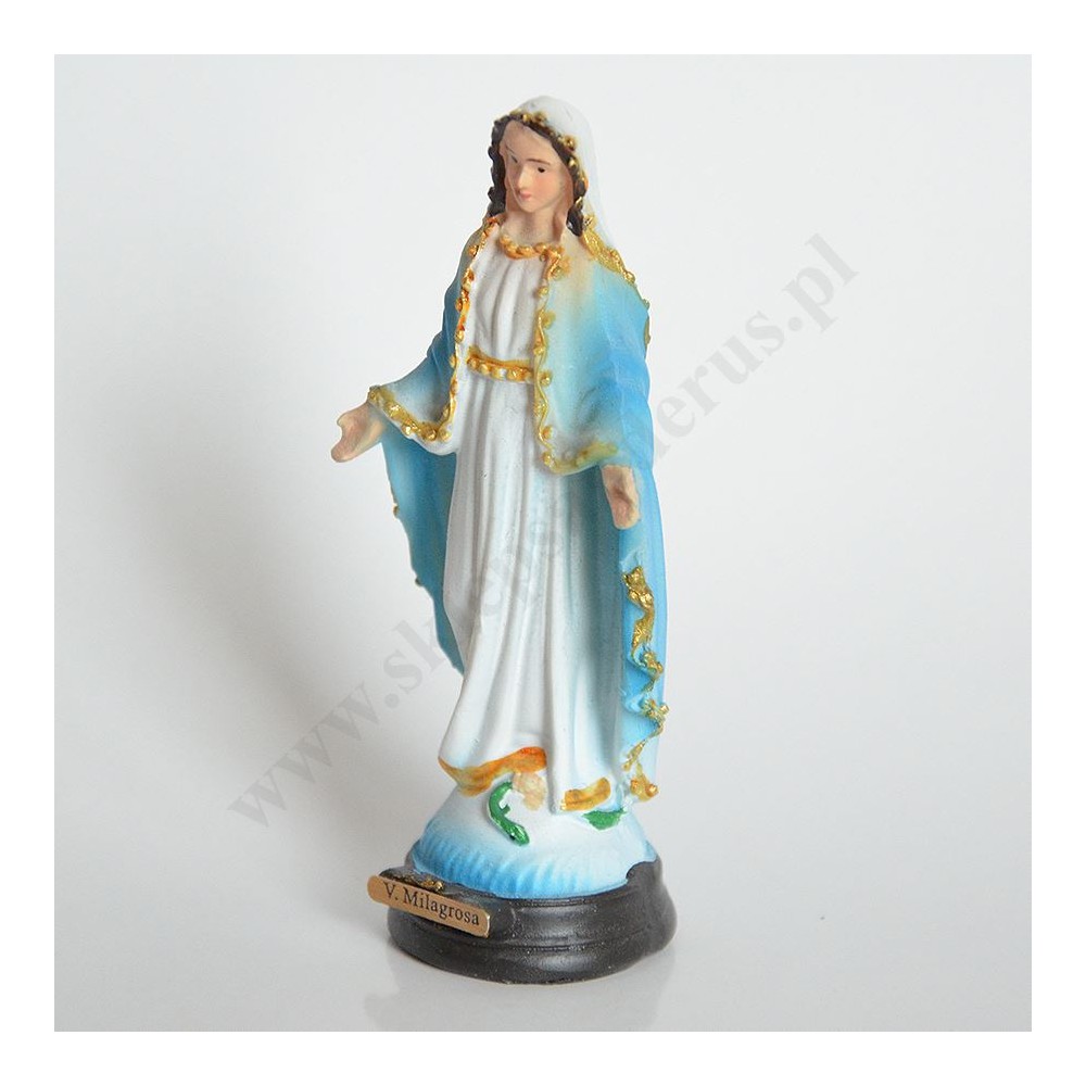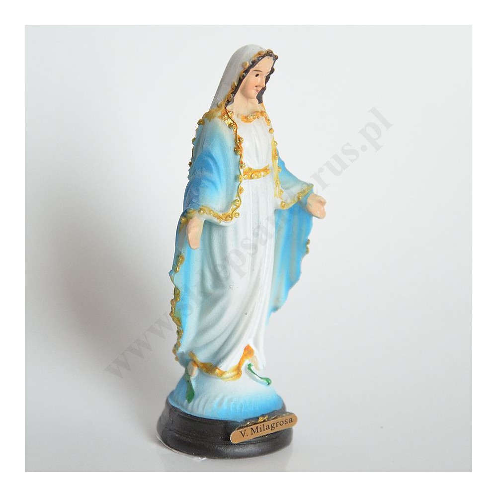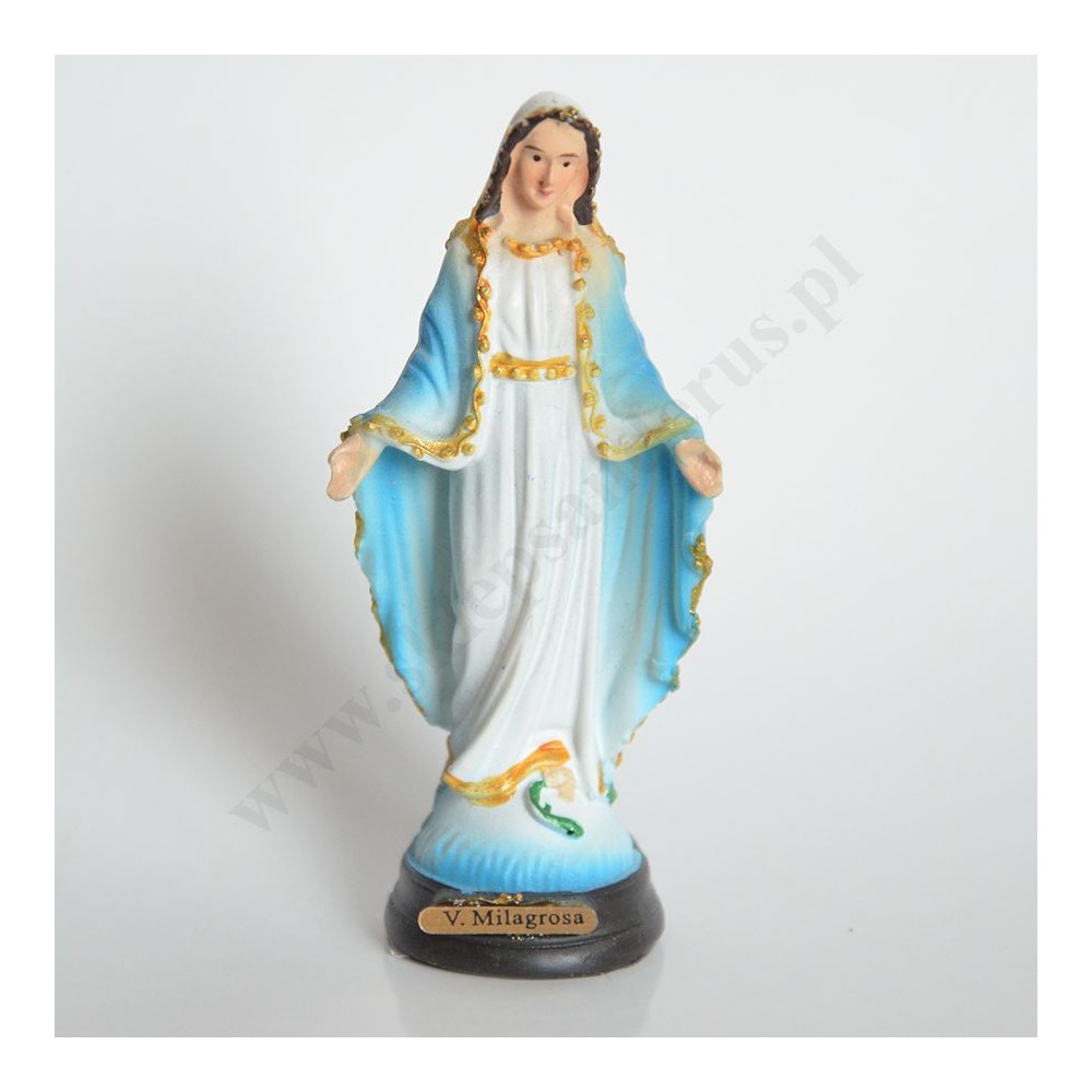 Figurka Matki Bożej Niepokalanej wykonana z tworzywa sztucznego o wysokości 10 cm i szerokości 4.5 cm.
