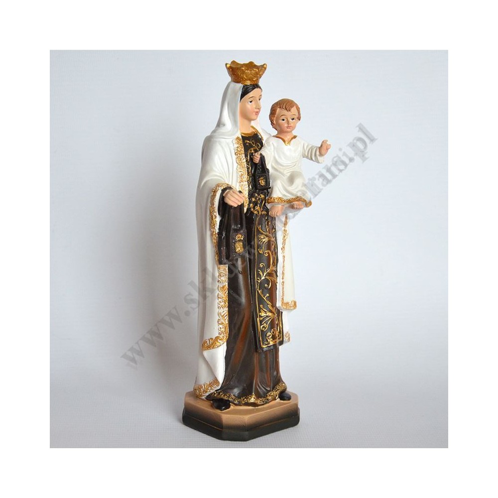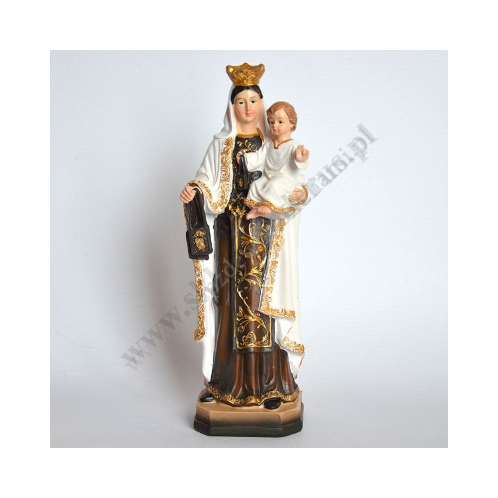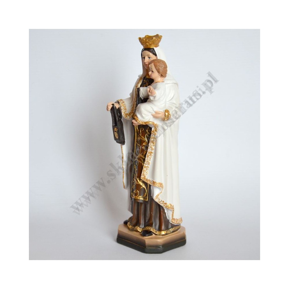 Figurka Matki Bożej Szkaplerznej wykonana z żywicy o wysokości 15 cm, szerokości 5.5 cm i głebokości 5.3 cm. Szerokość podstawy 4.7 cm, głębokość podstawy 4.3 cm.