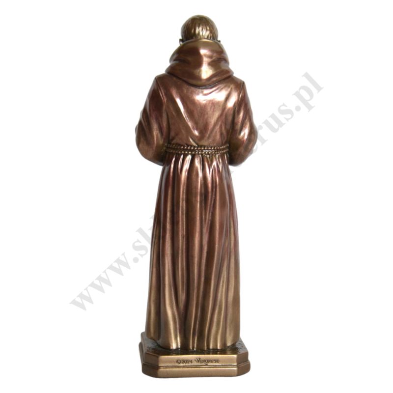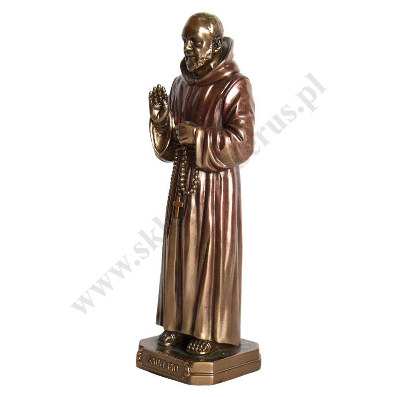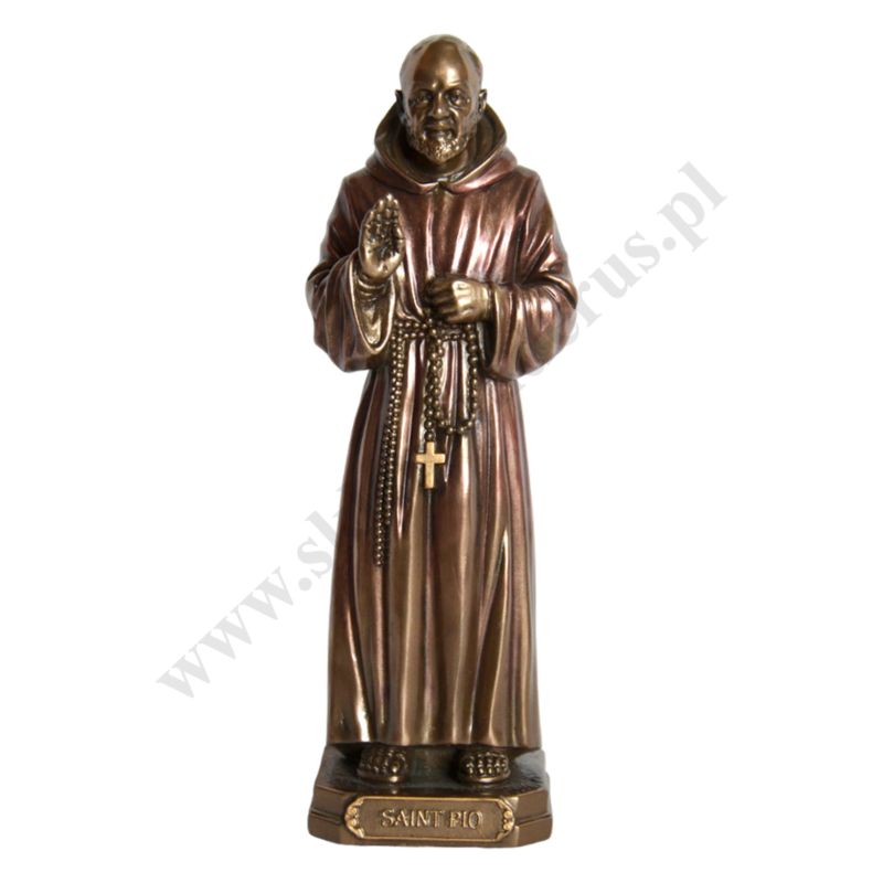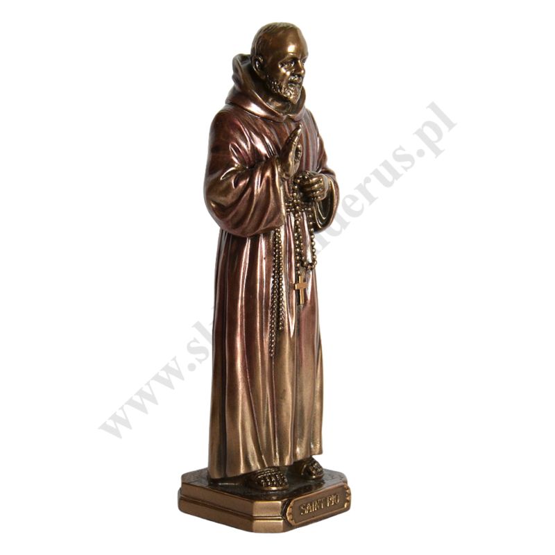 Figurka Ojca Pio wykonana z poliresingu czyli konglomeratu żywicy, mączki alabastrowej i ceramicznej, pokryta brązem. Wysokość figury 15.7 cm, szerokość figury 5.4 cm, głębokość figury 4.5 cm.