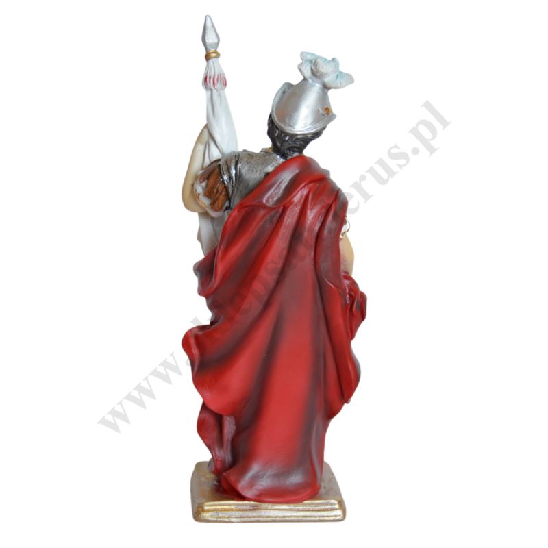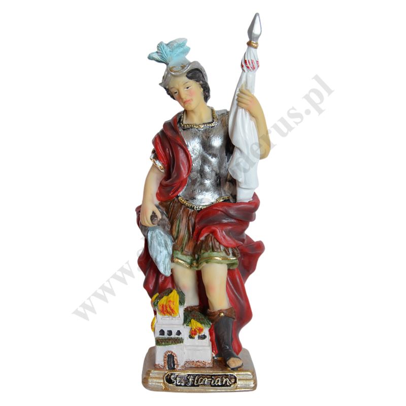 Figura Świętego Floriana wykonana z żywicy o wysokości 20.5 cm i szerokości 8 cm.