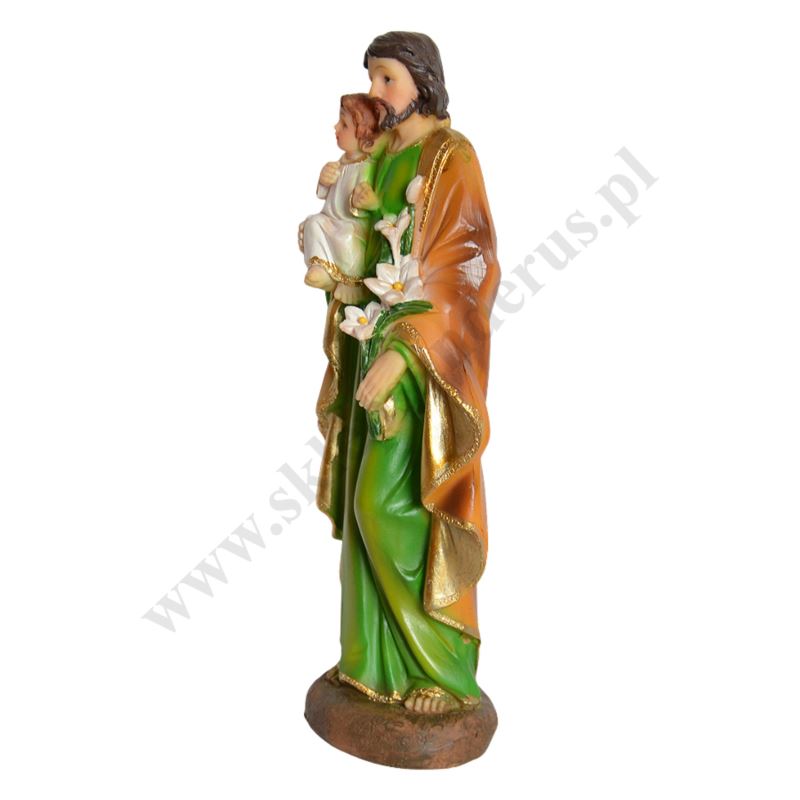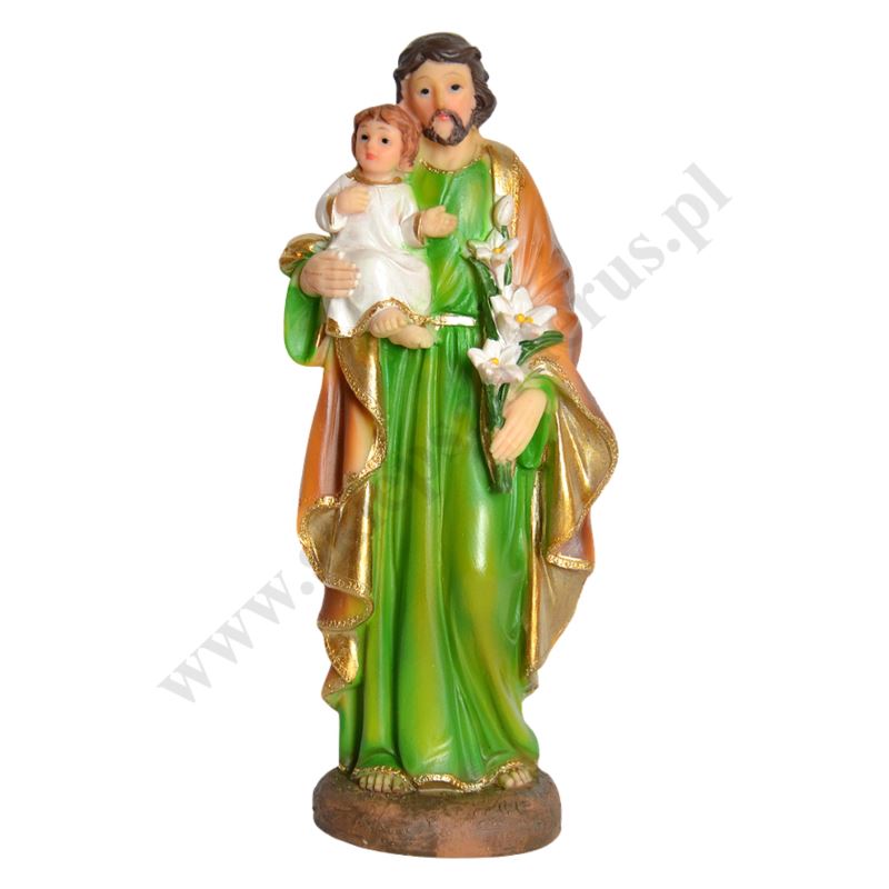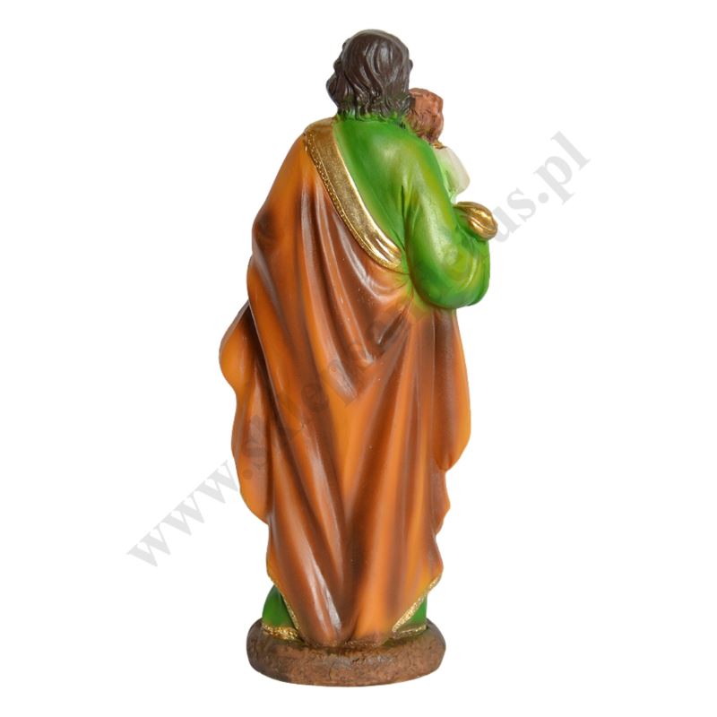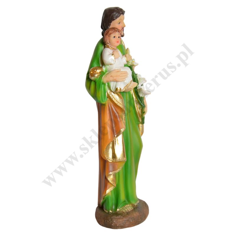 Figurka Świętego Józefa wykonana z żywicy o wysokości 19.5 cm, szerokości 8 cm i głębokości 5 cm.