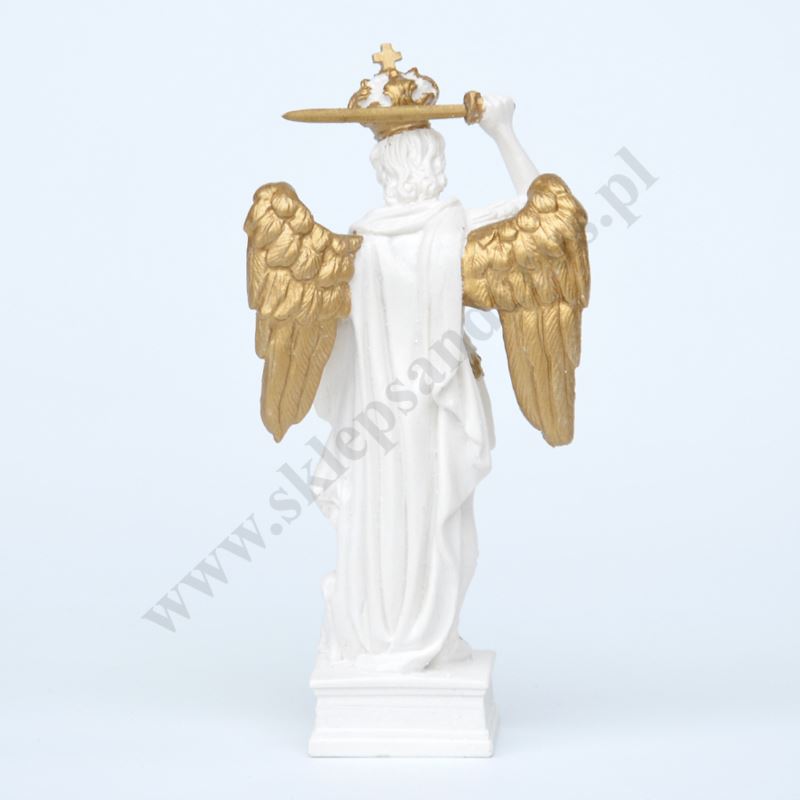 Figurka Świętego Michała Archanioła wykonana z żywicy o wysokości 13.5 cm i szerokości 6.5 cm.