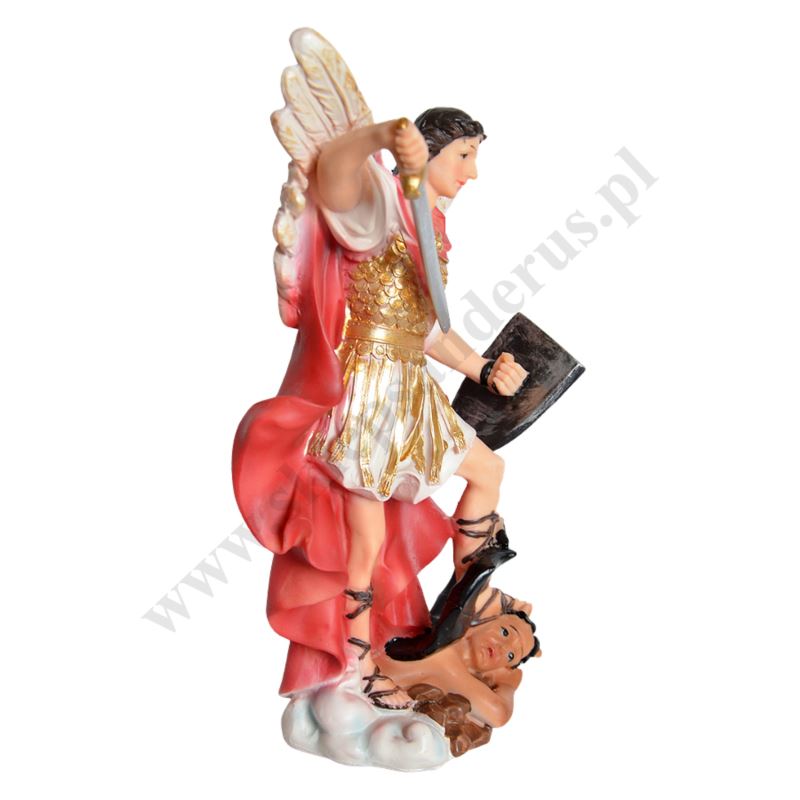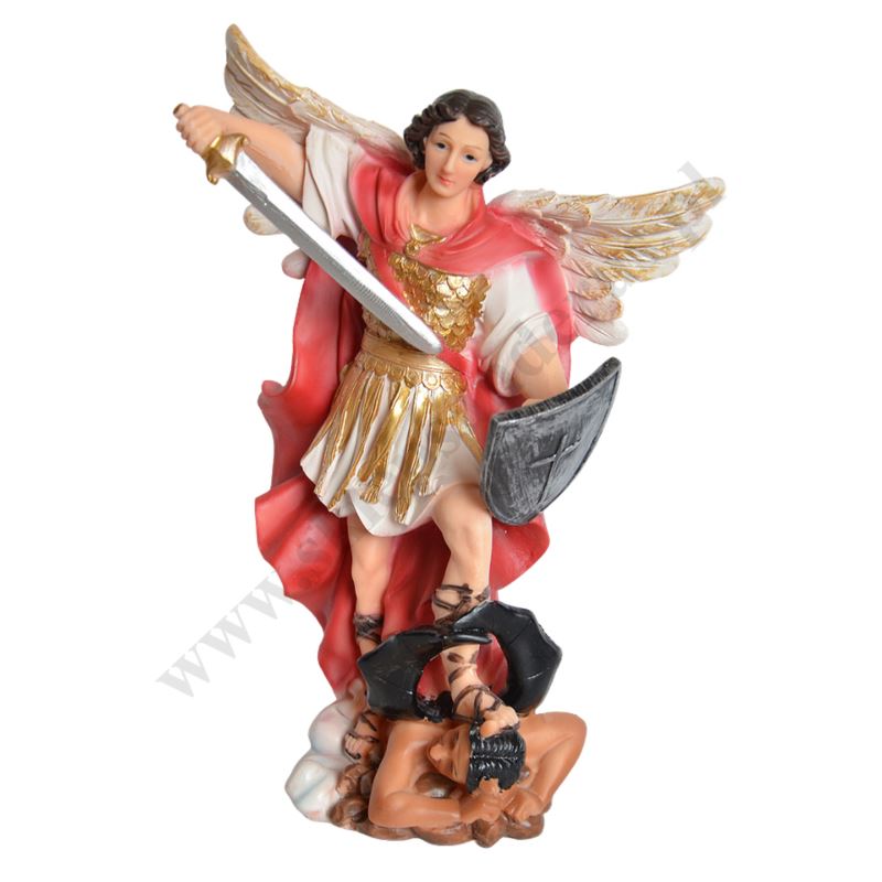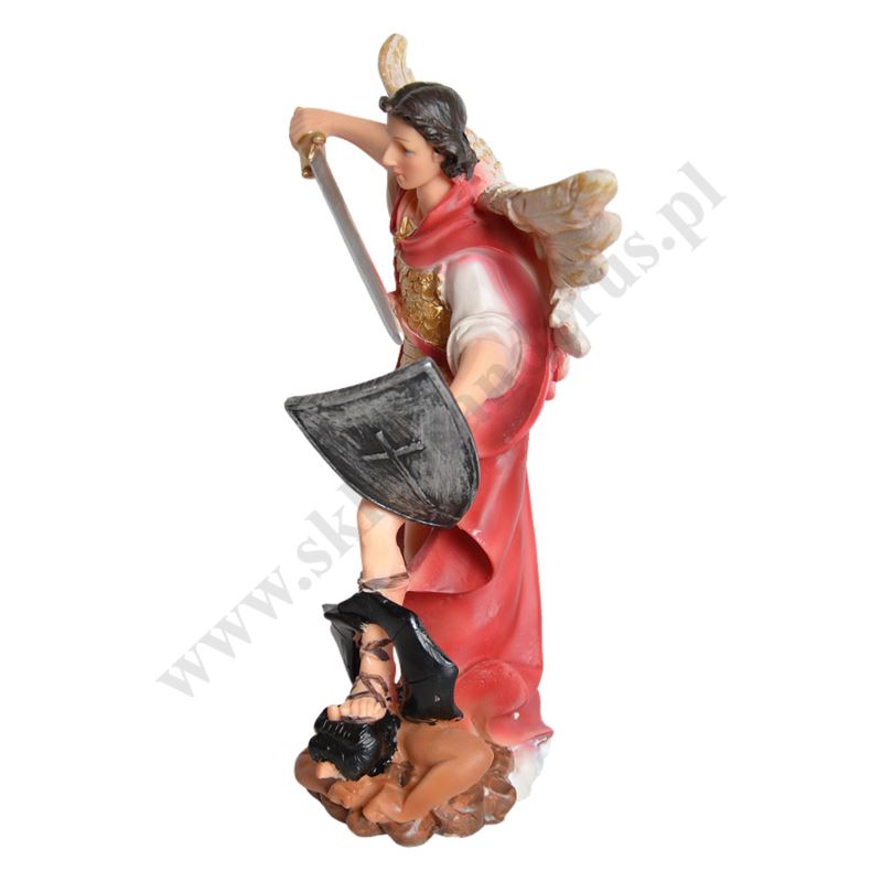 Figurka Świętego Michała Archanioła wykonana z żywicy o wysokości 26.5 cm, szerokości 17 cm i głębokości 10 cm.