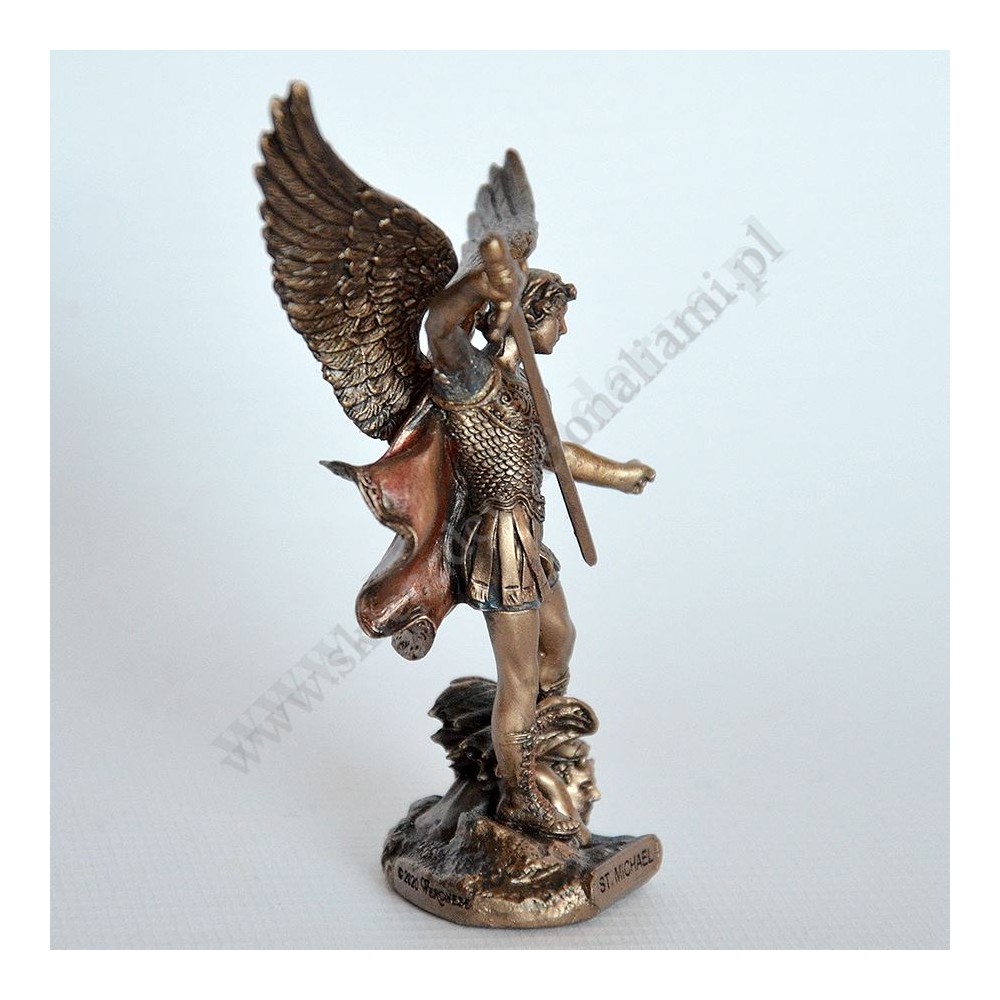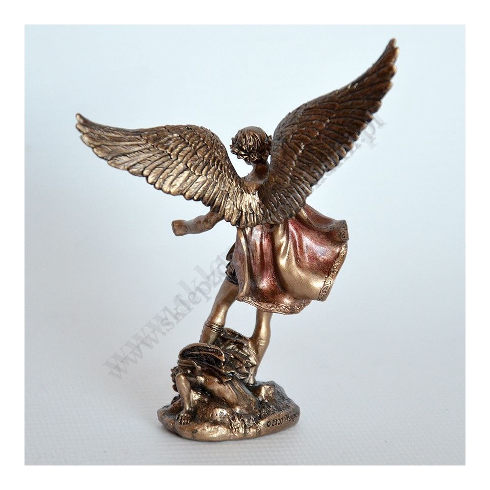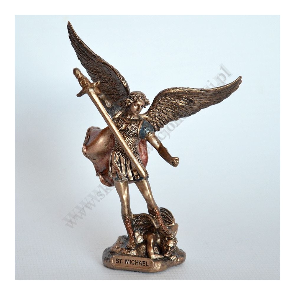 Figurka Świętego Michała Archanioła o wysokości 10.3 cm i szerokości 7.2 cm, wykonana z poliresingu czyli konglomeratu żywicy, mączki alabastrowej i ceramicznej, pokryta brązem.