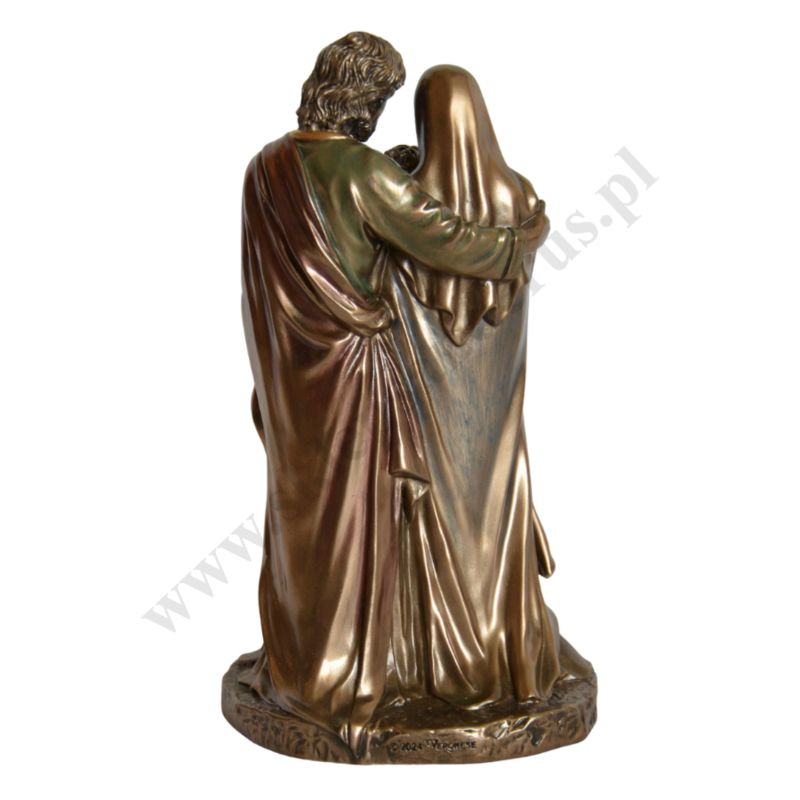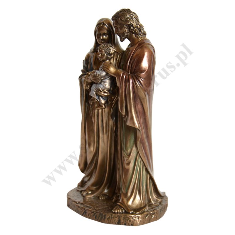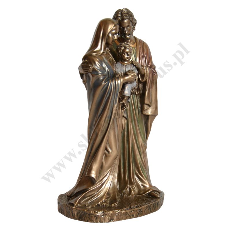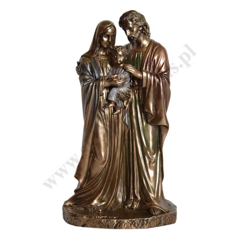 Figurka Świętej Rodziny wykonana z poliresingu czyli konglomeratu żywicy, mączki alabastrowej i ceramicznej, pokryta brązem. Wysokość figury 15.7 cm, szerokość figury 8.5 cm, głębokość figury 6.7 cm.