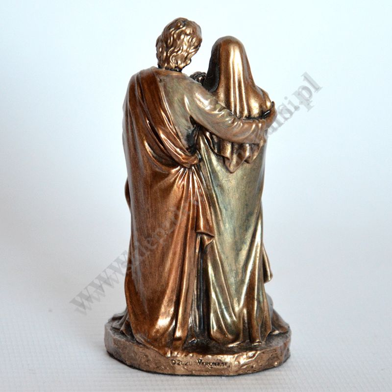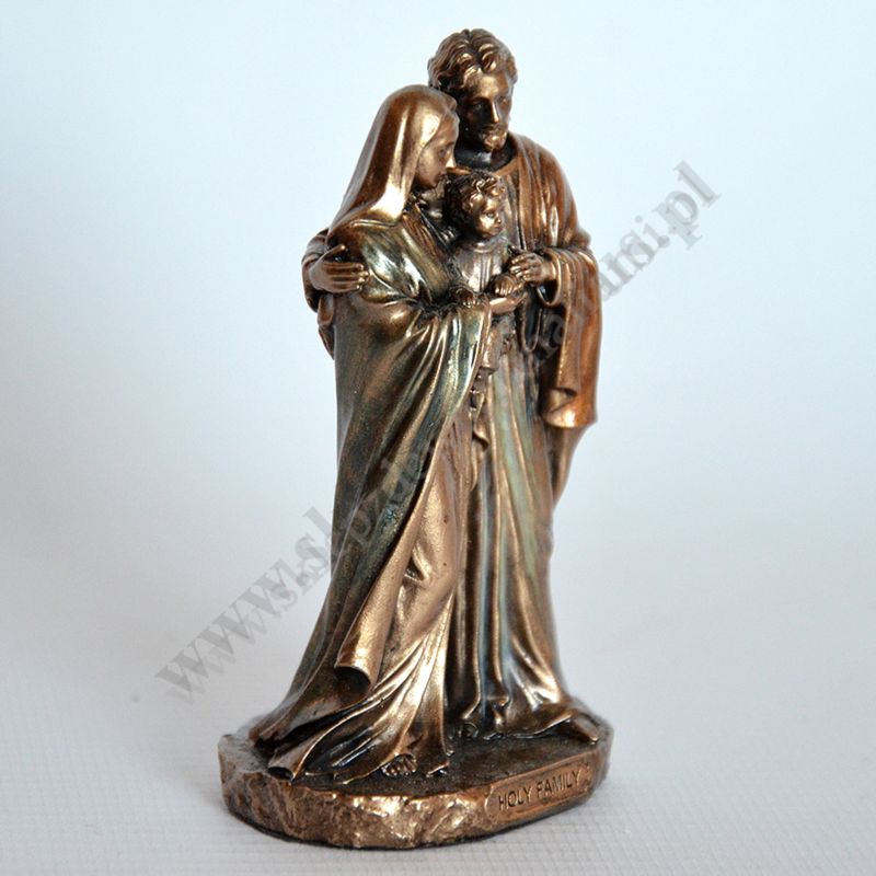 Figurka Świetej Rodziny o wysokości 8.2 cm i szerokości 4.7 cm, wykonana z poliresingu czyli konglomeratu żywicy, mączki alabastrowej i ceramicznej, pokryta brązem.