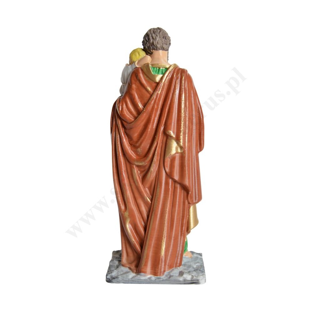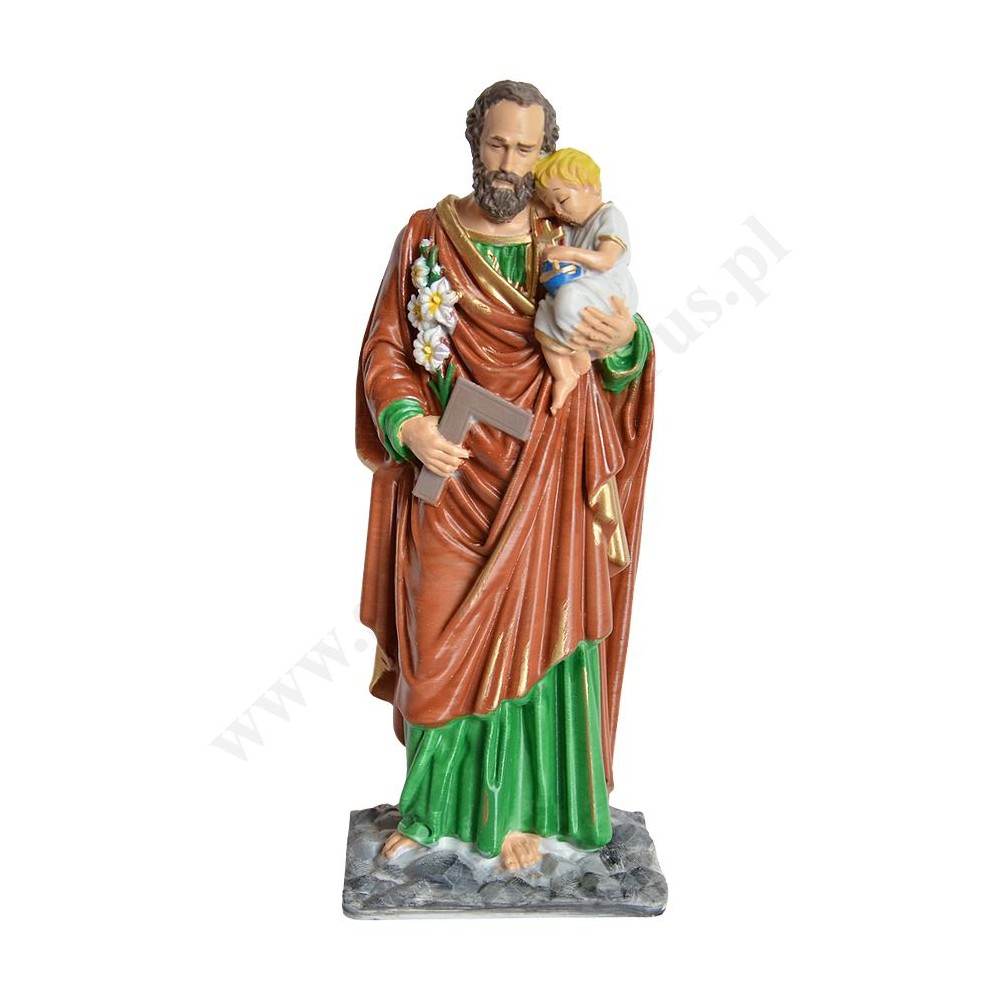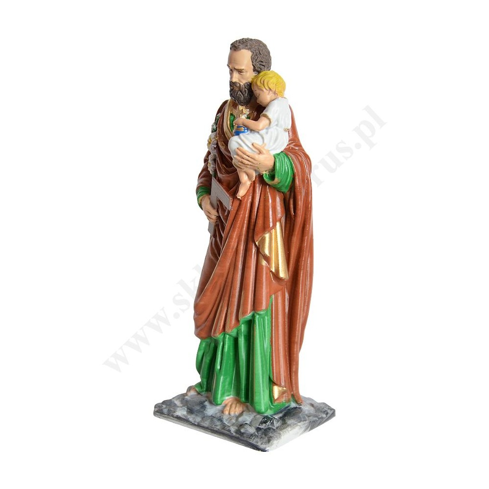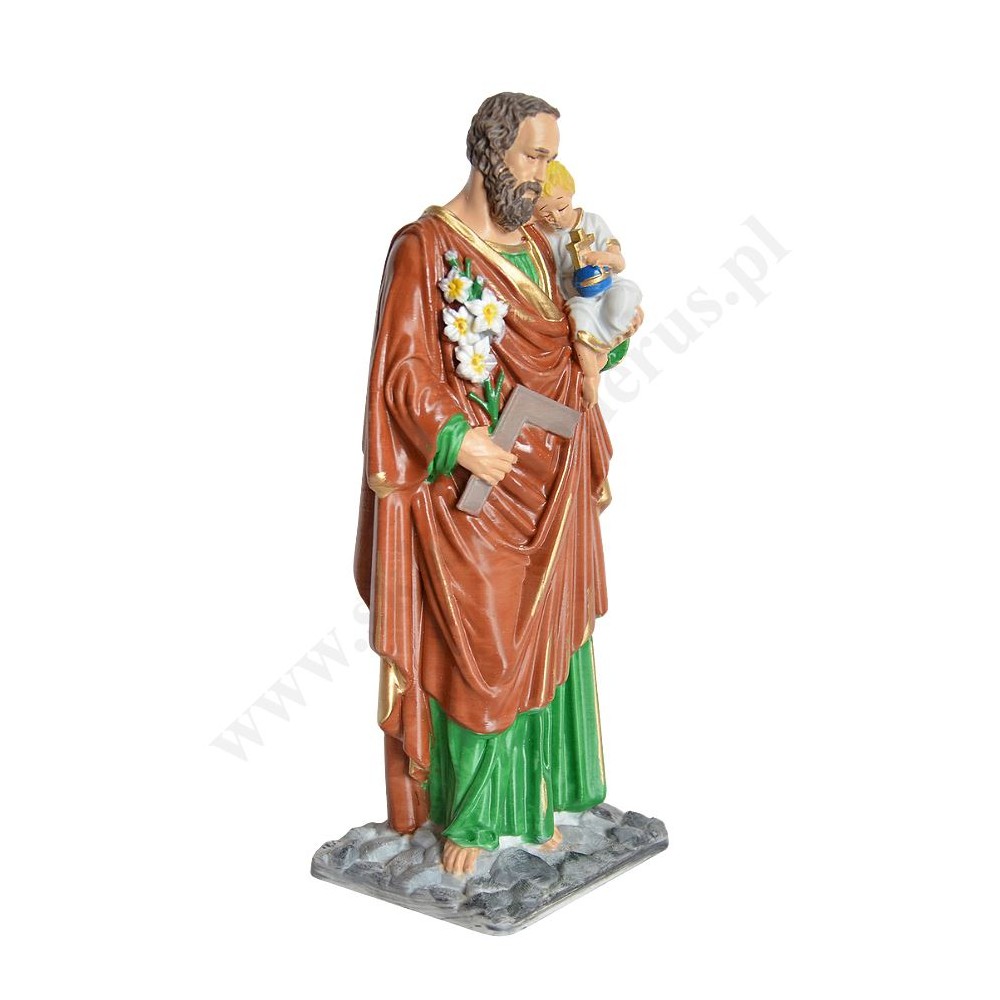Figurka Świętego Józefa wykonana z tworzywa sztucznego, ręcznie malowana. Wysokość figury 21 cm, szerokość 8.4 cm, głębokość 7 cm.