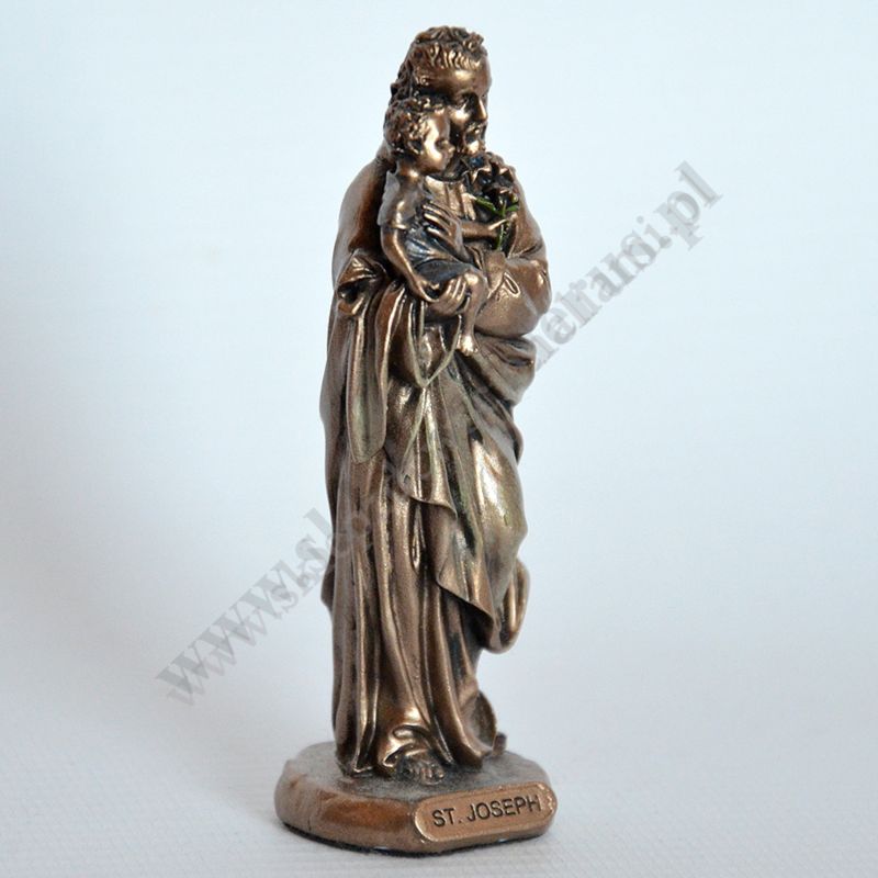Figurka Świetego Józefa o wysokości 8.6 cm i szerokości 2.8 cm, wykonana z poliresingu czyli konglomeratu żywicy, mączki alabastrowej i ceramicznej, pokryta brązem.
