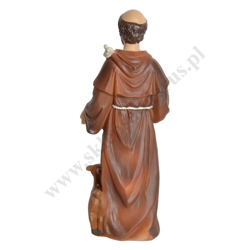 Figurka Świętego Franciszka wykonana z żywicy o wysokości 13.7 cm, szerokości 5.5 cm i głębokości 4 cm.