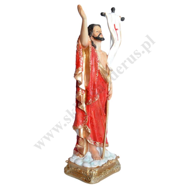 Figurka Pana Jezusa Zmartwychwstałego o wysokości 40 cm i szerokości 18 cm wykonana z żywicy.