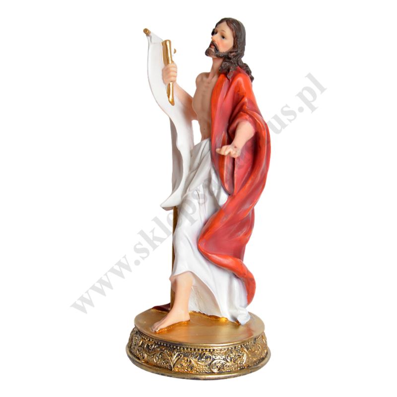 Figurka Pana Jezusa Zmartwychwstałego wykonana z żywicy o wysokośći 30 cm, szeorkości 15 cm i głębokości 12 cm.