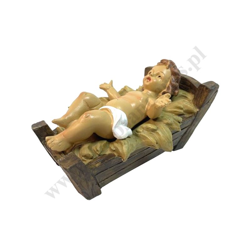 Figurka Dzieciątka Jezus w żłóbku wykonana z żywicy o długości 14.5 cm, szerokości 7 cm i wysokości 9 cm. Uwaga żłobek i dzieciątko w dwóch częściach.